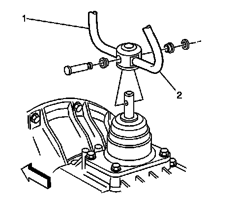 13. If equipped, with the 6.6/7.2L (1) or 8.1L (2) engine, and regular production options (RPOs) MSC/MSG, remove the retainer and bushing.