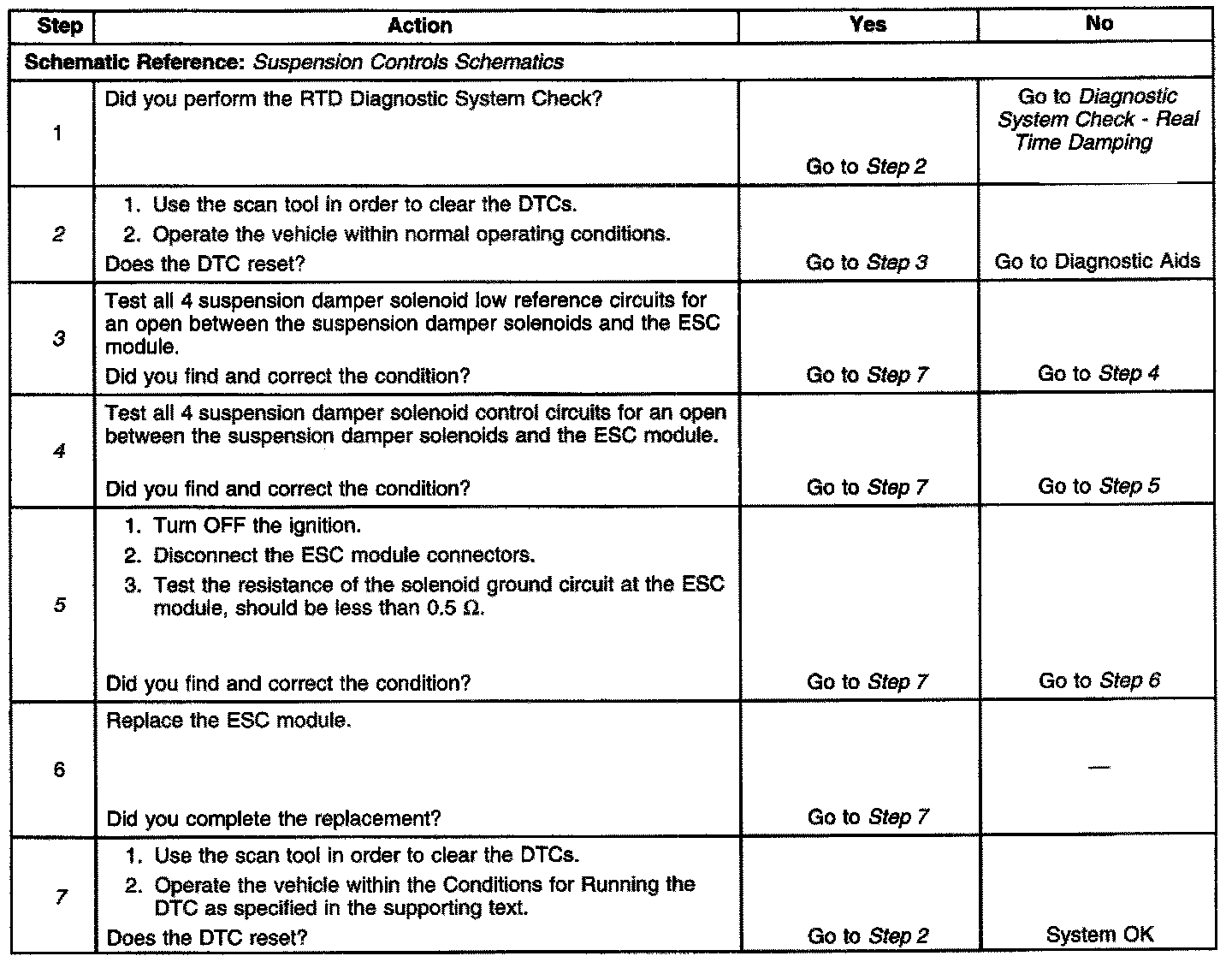 The Electronic Suspension Control (ESC) module provides a common low reference for all four of the suspension damper solenoids. The ESC module internally monitors the return voltage on the low reference circuit for a voltage out of range condition.