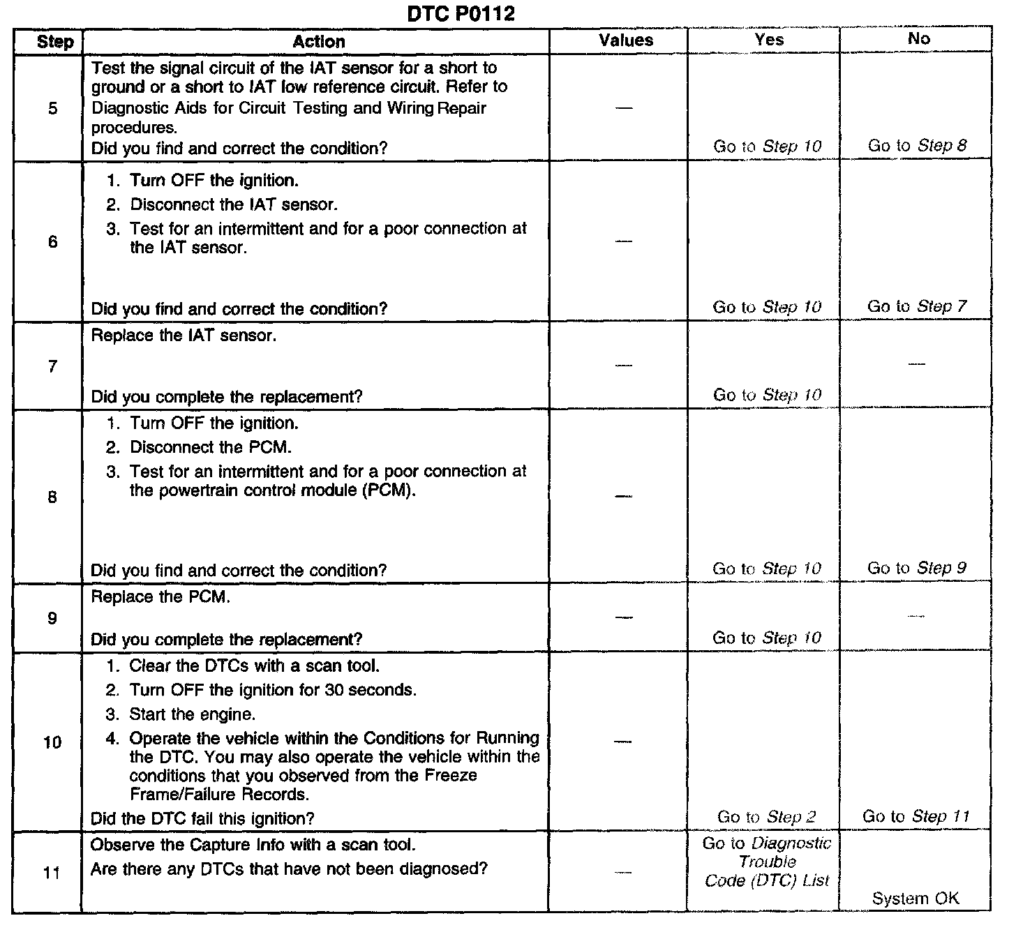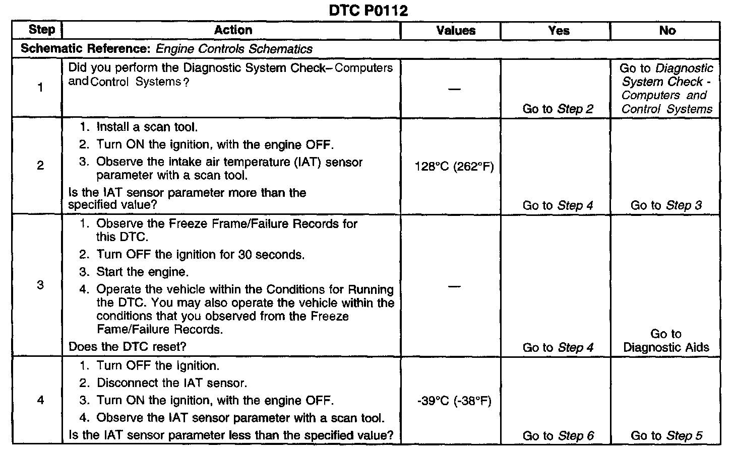 CIRCUIT DESCRIPTIONThe intake air temperature (IAT) sensor is a variable resistor, sometimes called a thermistor. The IAT sensor has a signal circuit and a low reference circuit. The IAT sensor measures the temperature of the air entering the engine. The powertrain control module (PCM) supplies 5 volts to the AT signal circuit. When the IAT sensor is cold, the sensor resistance is high. When the air temperature increases, the sensor resistance lowers. With high sensor resistance, the PCM detects a high voltage on the AT signal circuit. With lower sensor resistance, the PCM detects a lower voltage on the IAT signal circuit. If the PCM detects an excessively low IAT signal voltage, indicating a high temperature, DTC P0112 sets.