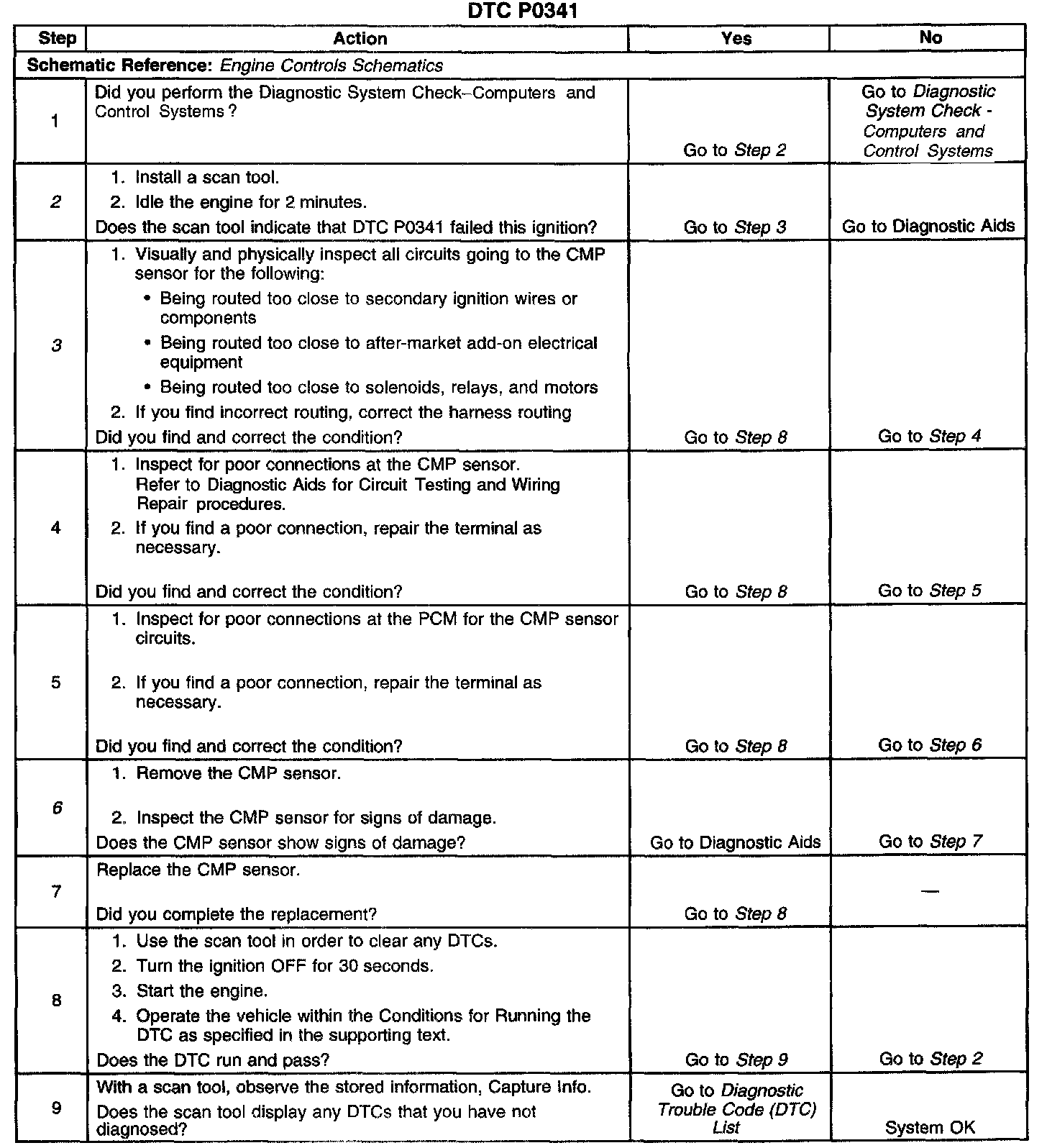 The CMP sensor determines whether a cylinder is on a tiring stroke or on an exhaust stroke. As the camshaft rotates, the reluctor wheel interrupts a magnetic field produced by a magnet within the sensor. The sensors internal circuitry detects this and produces a signal which the PCM reads. The PCM uses this 1 X signal in combination with the crankshaft position (CKP) sensor 24 X signal in order to determine CKP and stroke. This diagnostic for the CMP sensor checks for a loss of CMP sensor signal. Observe that as long as the PCM receives the CKP sensor 24 X signal, the engine will start. The PCM can determine top dead center (TDC) for all cylinders by using the CKP sensor 24 X signal alone. The CMP sensor 1 X signal is used by the PCM to determine if the cylinder at TDC is on the firing stroke or the exhaust stroke. The system attempts synchronization and looks for an increase in engine speed indicating the engine started. If the PCM does not detect an increase in engine speed, the PCM assumes the PCM incorrectly synchronized to the exhaust stroke and re-syncs to the opposite cam position. A slightly longer cranking time may be a symptom of this condition.
