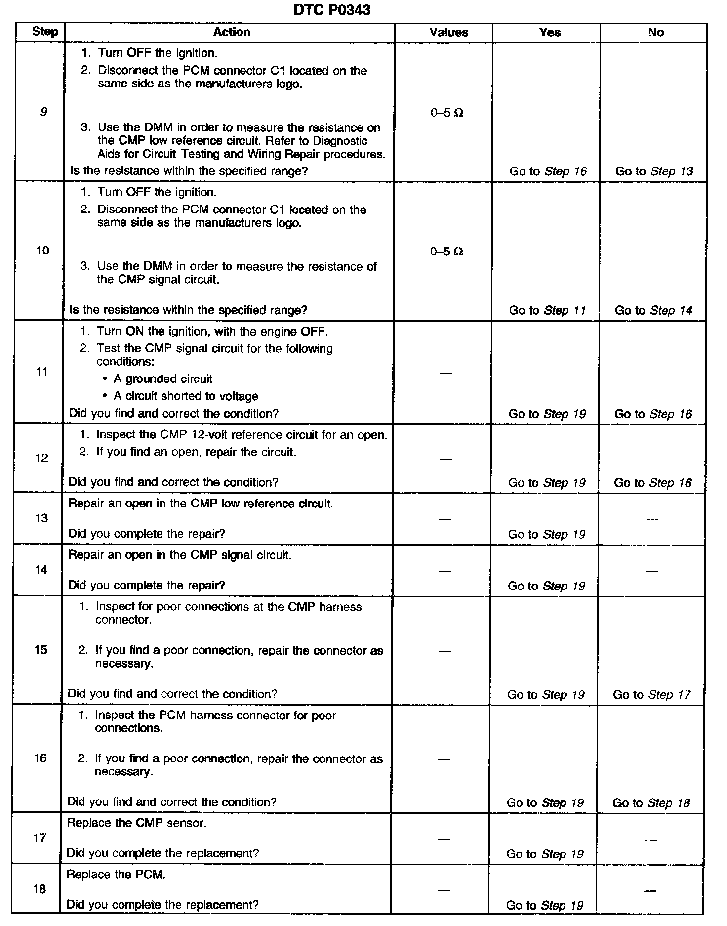 9. This step tests the resistance of the CMP sensor low reference circuit from the PCM to the CMP sensor.