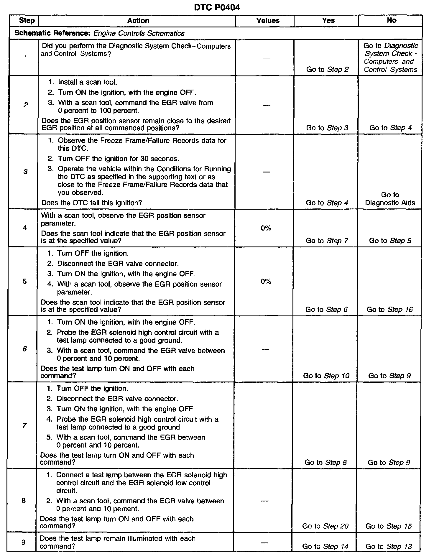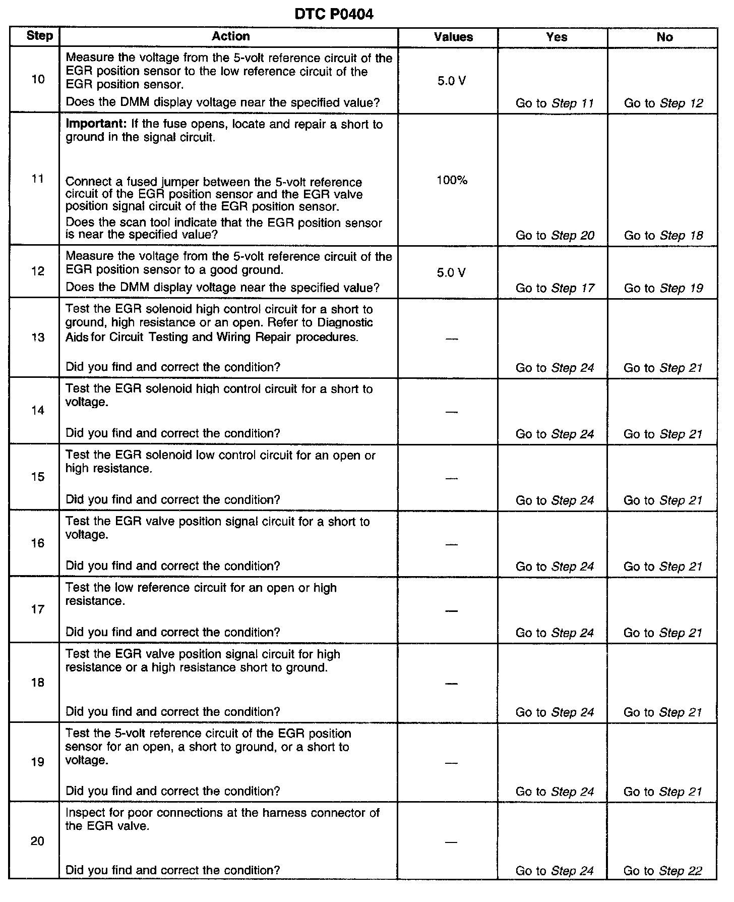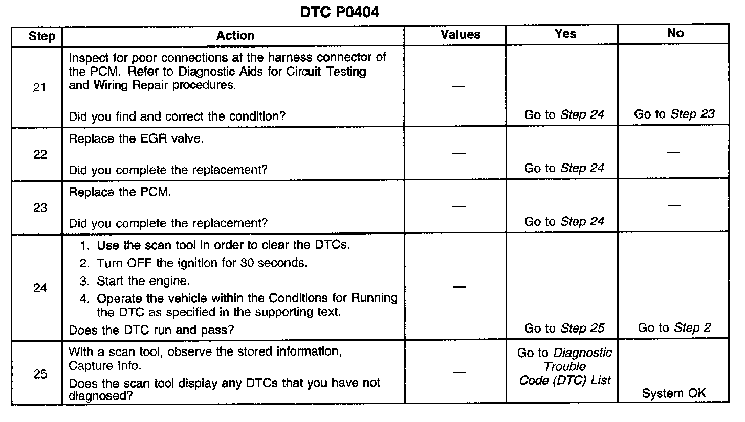 3. If DTC P0404 will only set under certain conditions, the malfunction may be intermittent. Refer to Diagnostic Aids. If an intermittent wiring problem is not present, test for a faulty connection at the PCM or the EGR valve. If the connections are OK and DTC P0404 continues to set, replace the EGR valve.