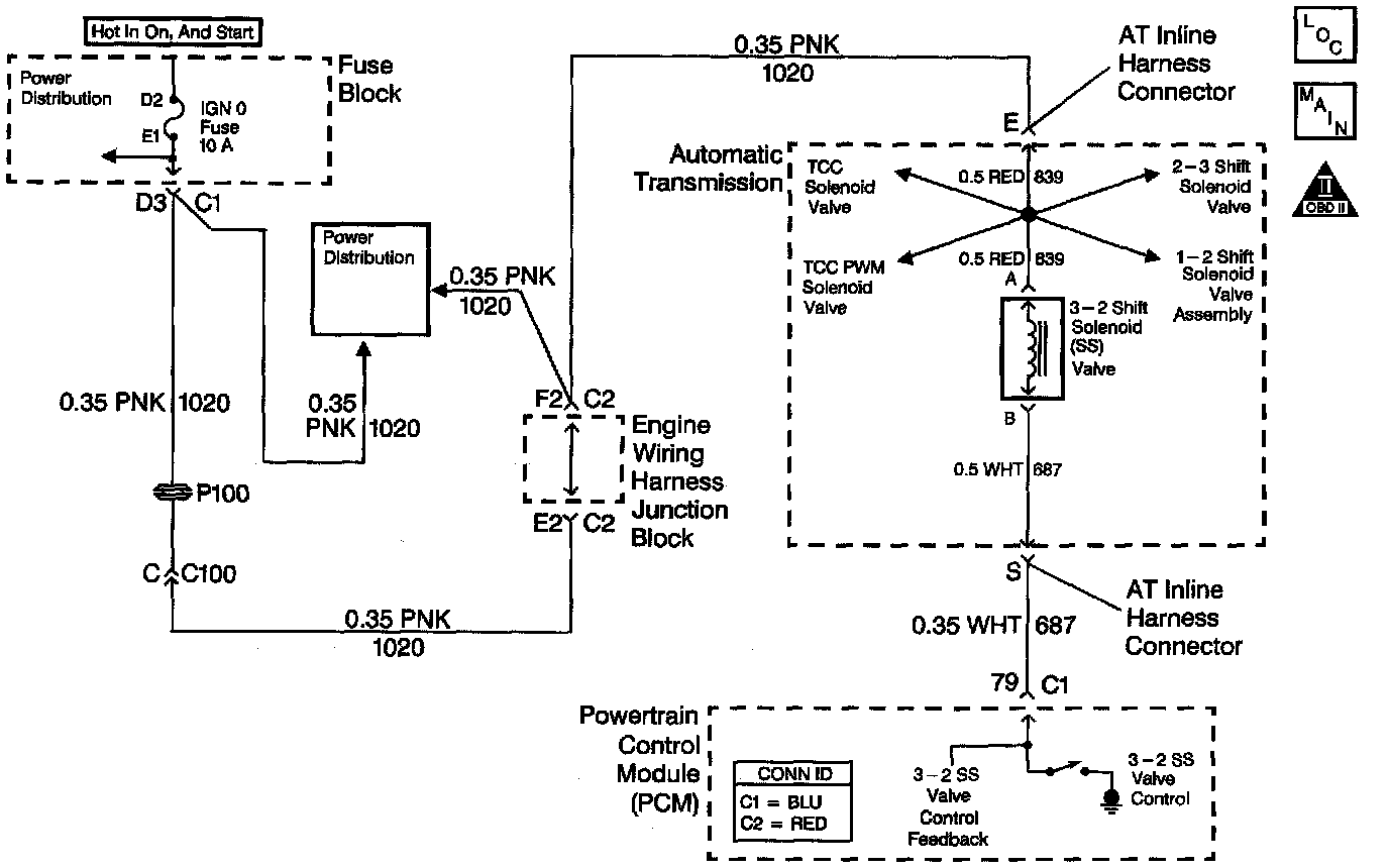 The 3-2 shift solenoid (SS) valve assembly is a normally-closed, 3-port, on/off device that controls the 3-2 downshift. The solenoid attaches to the control valve body within the transmission. The solenoid receives ignition voltage through the OFF/ON/CRANK voltage circuit. The powertrain control module (PCM) controls the solenoid by providing a ground path on the 3-2 shift solenoid valve control circuit. During a 3-2 downshift, the 2-4 band applies as the 3-4 clutch releases. The PCM varies the timing between the 3-4 clutch release and the 2-4 band apply, depending on the vehicle speed and the throttle position.
