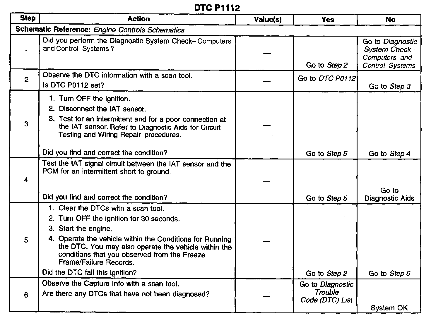 CIRCUIT DESCRIPTIONThe intake air temperature (IAT) sensor is a variable resistor, sometimes called a thermistor. The IAT sensor has a signal circuit and a low reference circuit. The IAT sensor measures the temperature of the air entering the engine. The powertrain control module (PCM) supplies 5 volts to the AT signal circuit. When the IAT sensor is cold, the sensor resistance is high. When the air temperature increases, the sensor resistance lowers. With high sensor resistance, the PCM detects a high voltage on the IAT signal circuit. With lower sensor resistance, the PCM detects a lower voltage on the IAT signal circuit. If the PCM detects an intermittent low IAT signal voltage, indicating a high temperature, DTC P1112 sets.