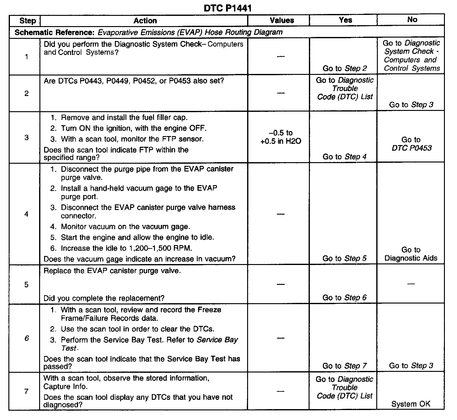 CIRCUIT DESCRIPTIONThis DTC tests for undesired intake manifold vacuum flow to the evaporative emission (EVAP) system. The control module seals the EVAP system by commanding the EVAP purge valve OFF, closed, and the EVAP vent valve ON, closed. The control module monitors the fuel tank pressure (FTP) sensor to determine if a vacuum is being drawn on the EVAP system. If the vacuum in the EVAP system is more than a predetermined value within a predetermined time, DTC P1441 will set.