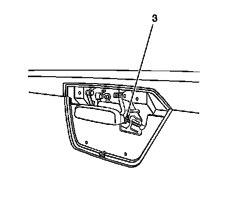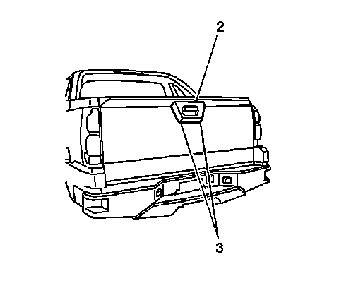 3. Remove the endgate handle bezel (2) by using a flat-bladed tool to release the push-in retainers attached to the bezel directly below the handle (3).