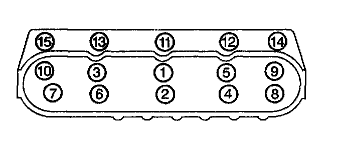 8.4. Tighten the Me cylinder head bolts (11,12,13,14,15) to 30 Nm (22 ft. lbs.). Begin with the center bolt (11) and alternating side-to-side, work outward tightening all of the bolts.