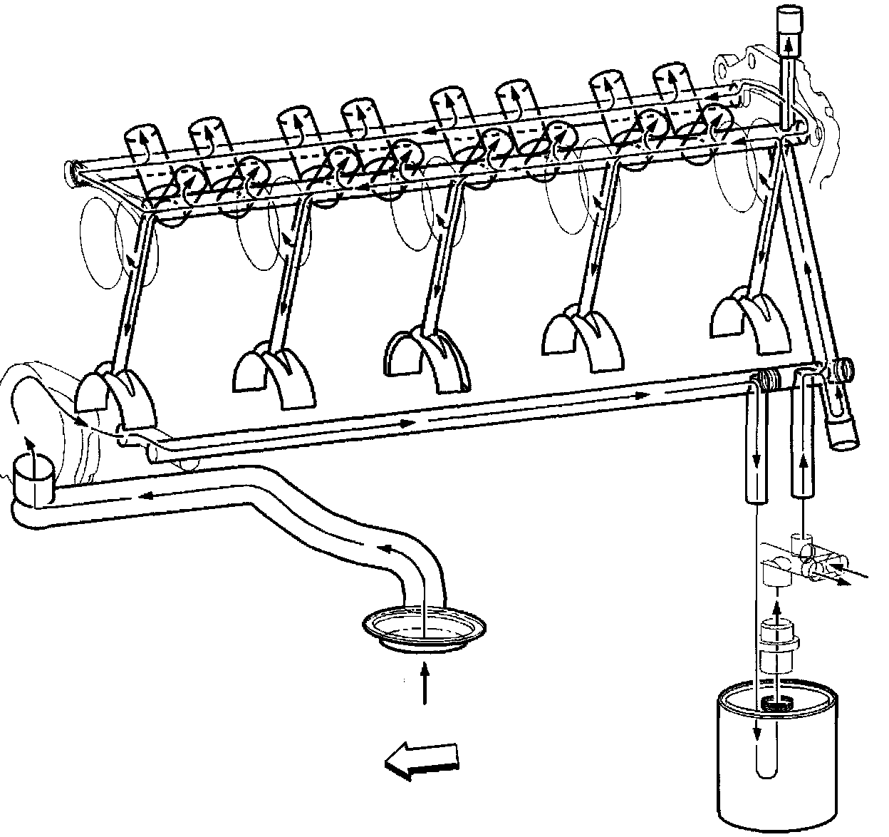 A external oil cooler is available on certain applications (all 6.0 L). Oil is directed from the oil pump, through the lower main oil gallery to the full flow oil filter. Oil is then directed through the oil pan outlet oil gallery (located in the left rear of the oil pan) and to the external oil cooler via a hose assembly. Oil flows through the oil cooler and returns to the engine at the oil pan inlet oil gallery (located in the left rear of the oil pan). Oil is then directed to the upper main oil galleries and the remainder of the engine assembly.