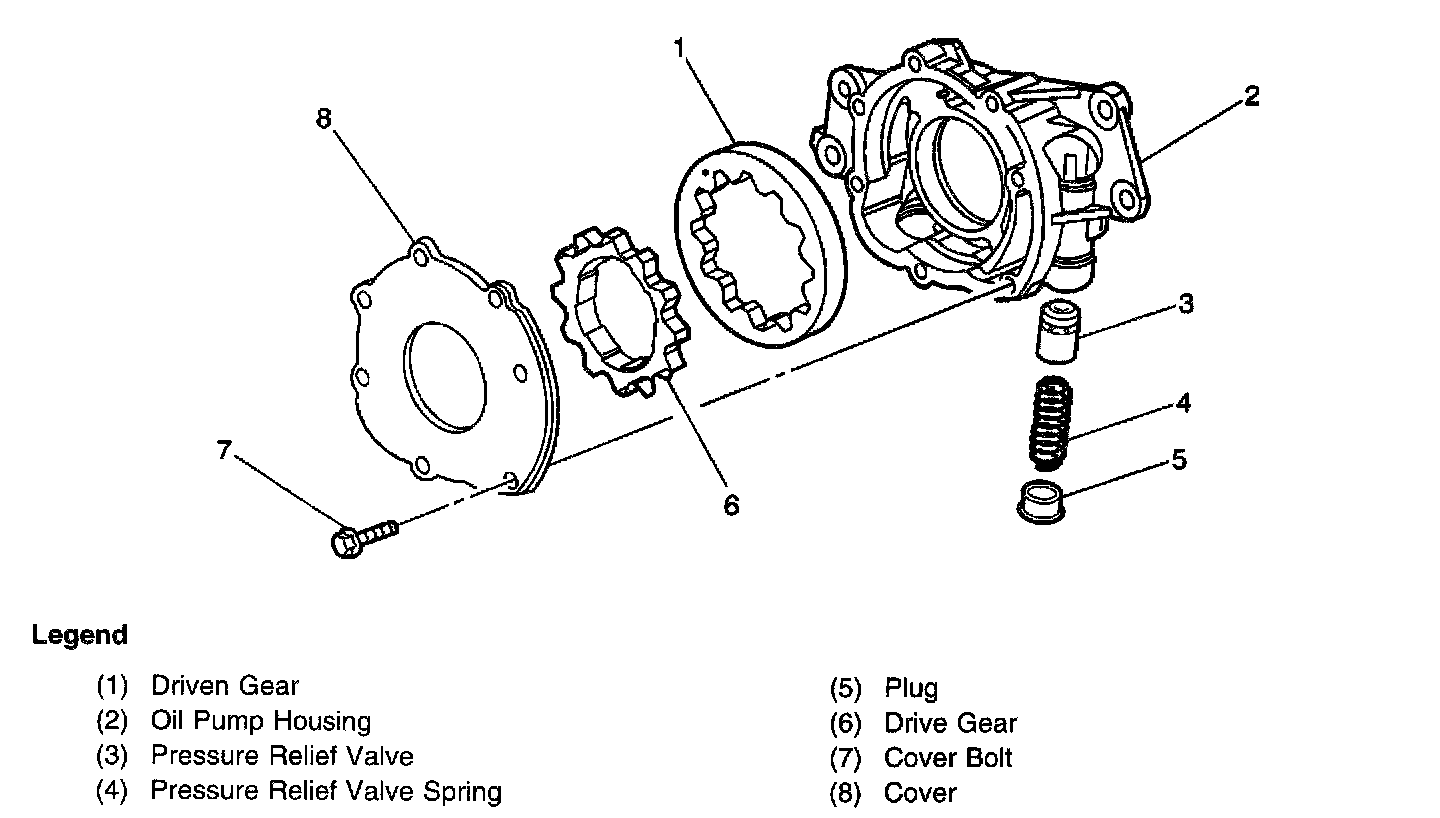 The splined crankshaft sprocket is positioned to the crankshaft by a key and keyway. The crankshaft sprocket splines drive the oil pump driven gear. A retaining plate mounted to the front of the engine block maintains camshaft location.