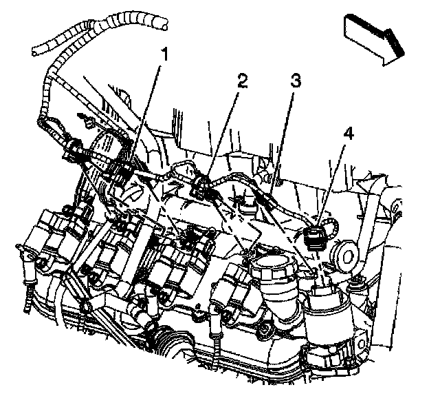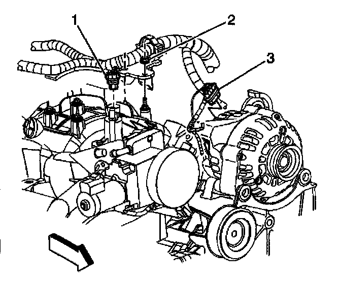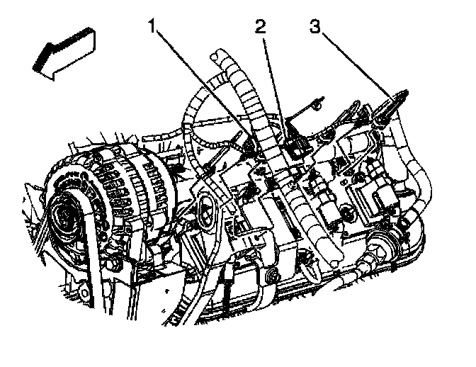 52. Connect the main coil harness (2) and fuel injector (3) electrical connectors on the left side.