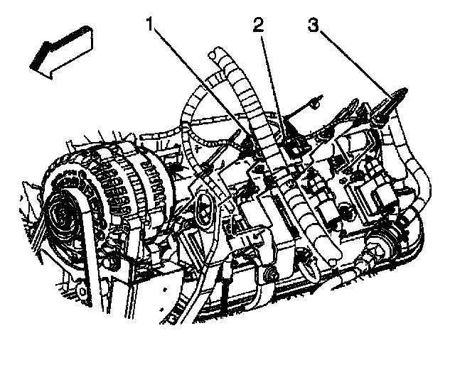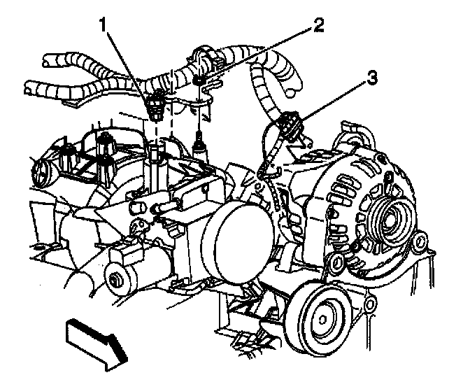 31. Disconnect the main coil harness (2) and fuel injector (3) electrical connectors on the left side.