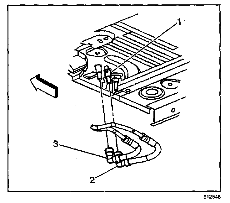 10. Install the heater lines (2, 3) to the auxiliary HVAC module at the underside of vehicle.