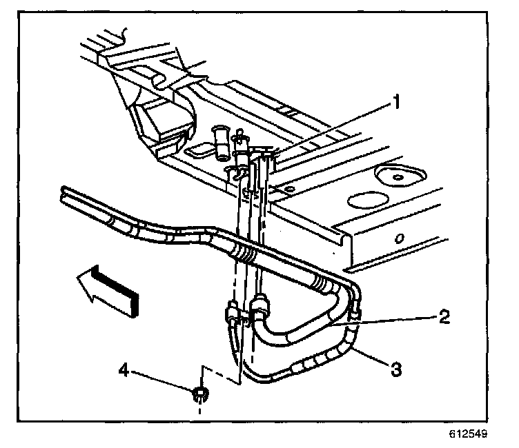 4. Disconnect the heater lines (2, 3) from the auxiliary HVAC module at the underside of the vehicle.