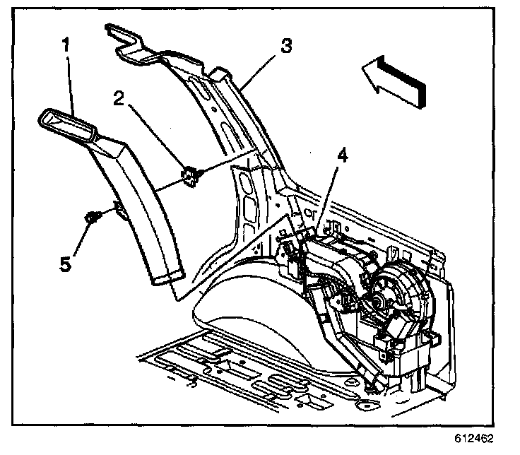 12. Remove the fastener (5) for the upper auxiliary air duct (1). Carefully slide the duct up, into the headliner, until the bottom edge of the duct is above the air distributor duct.