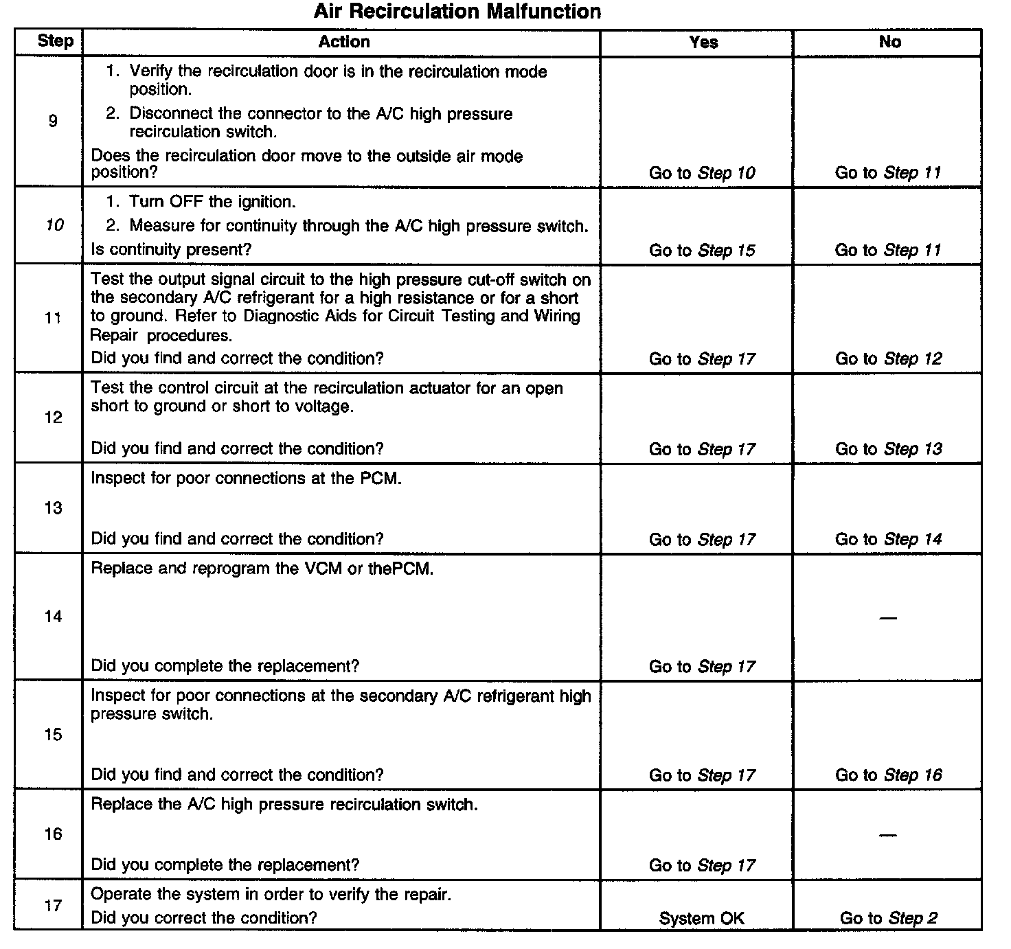 10. This step tests for a internally shorted A/C high pressure recirculation switch causing the automatic recirculation mode to be active.