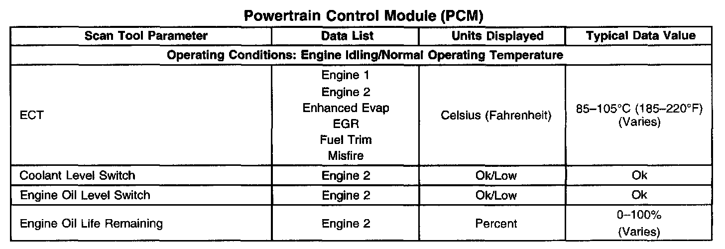 Scan Tool Data List - Powertrain Control Module (PCM)