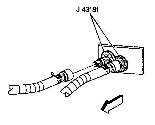 8. Firmly pull the J 43181 into the quick connect end of the outlet hose.