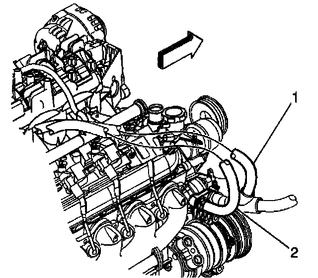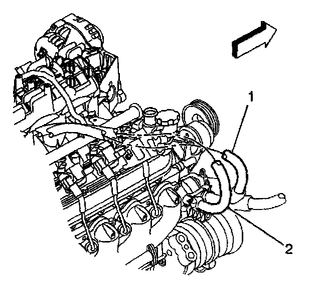 5. If equipped with RPO C36 auxiliary heater, remove the surge tank theater outlet hose (1) from the mounting clip.