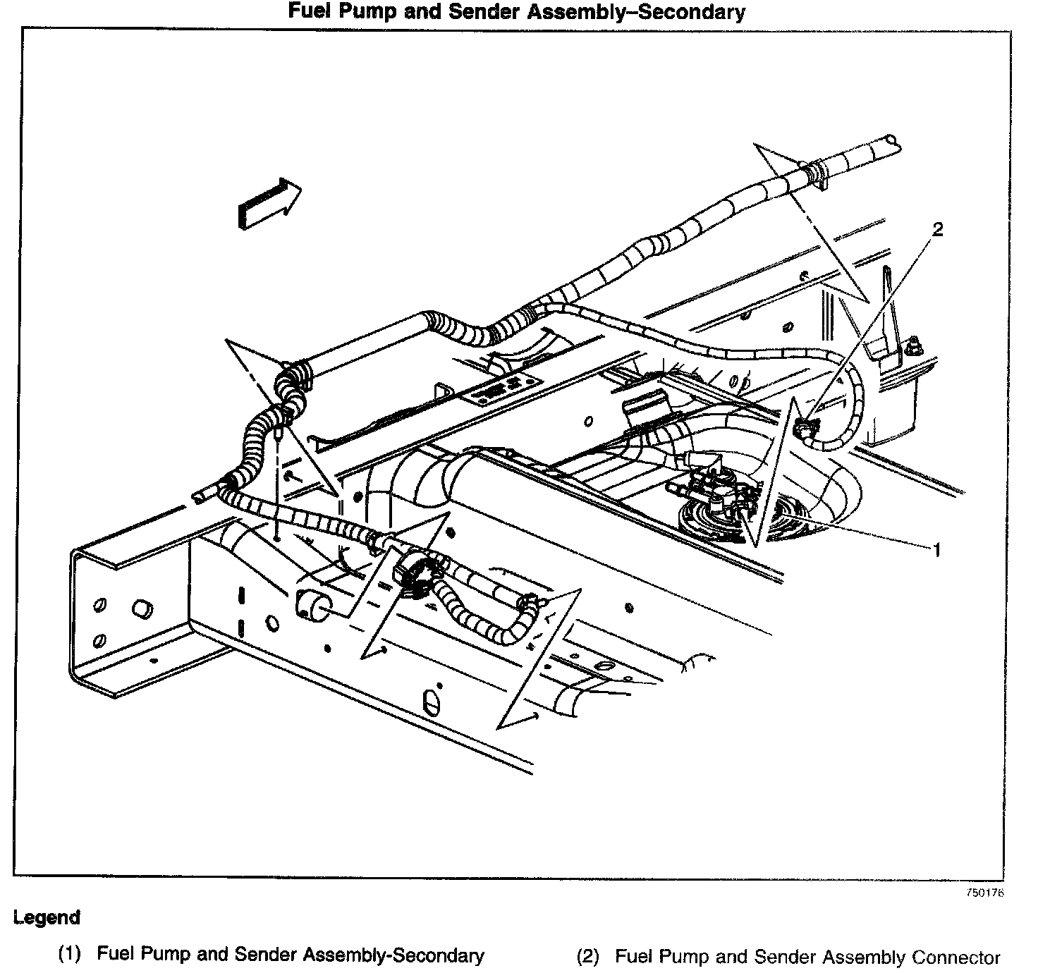 The Secondary Fuel Pump is located in the Fuel Sender Assembly. The Fuel Sender Assembly is located in the Secondary Fuel Tank.