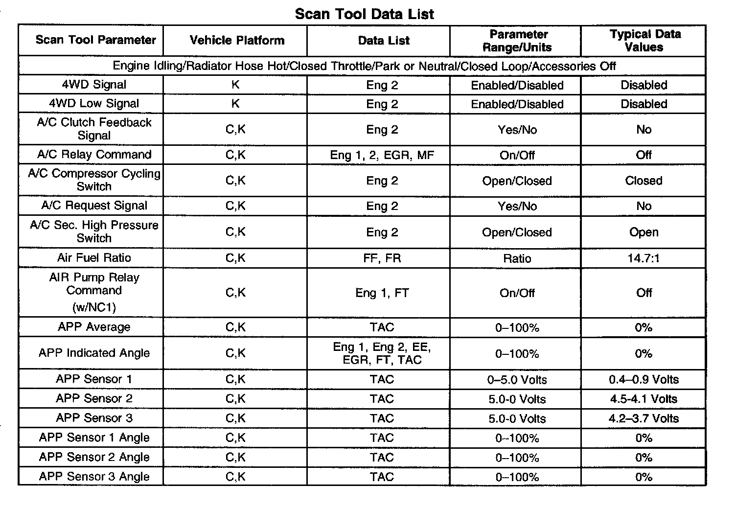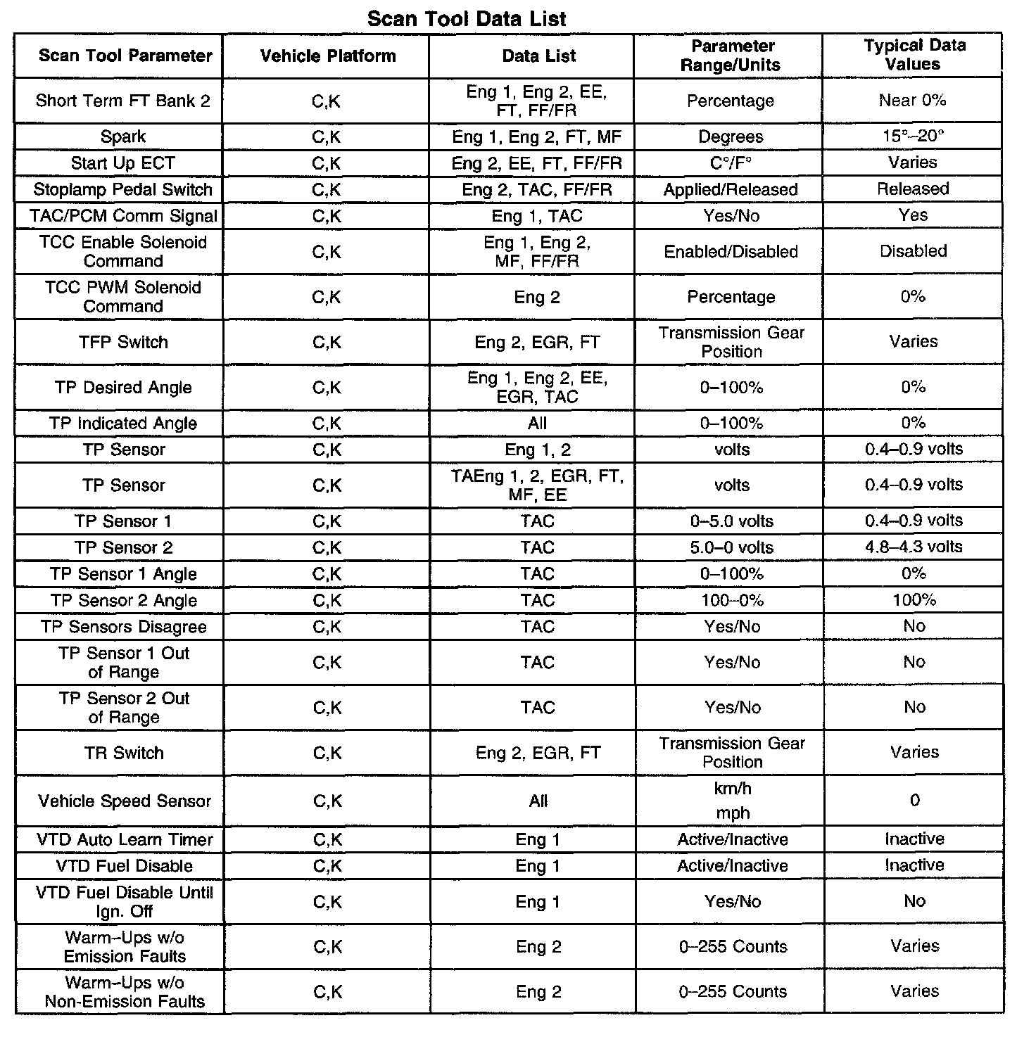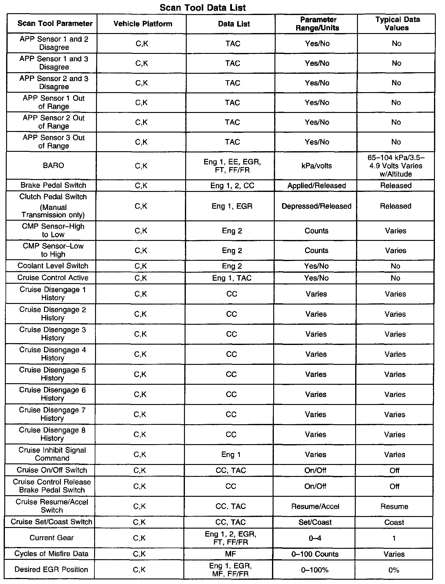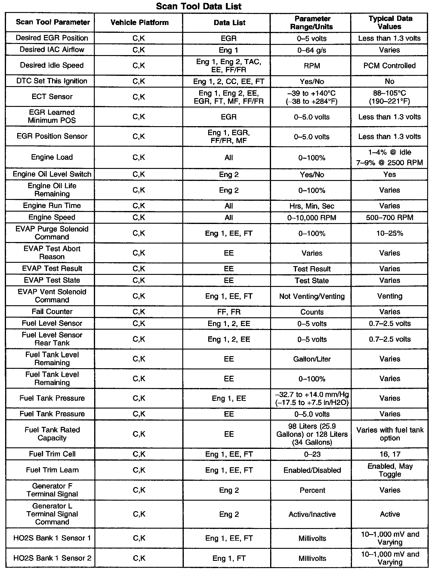 The Engine Scan Tool Data List contains all engine related parameters that are available on the scan tool. The list is arranged in alphabetical order. A given parameter may appear in any one of the data lists, and in some cases may appear more than once, or in more than one data list in order to group certain related parameters together.