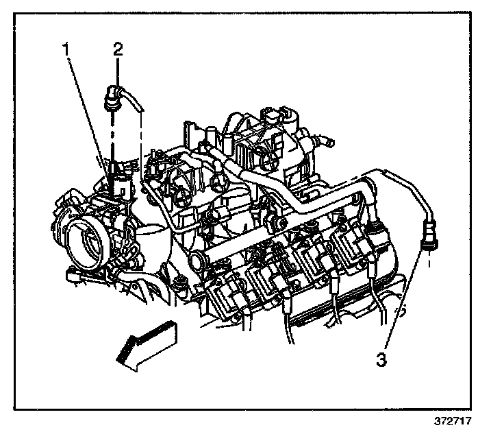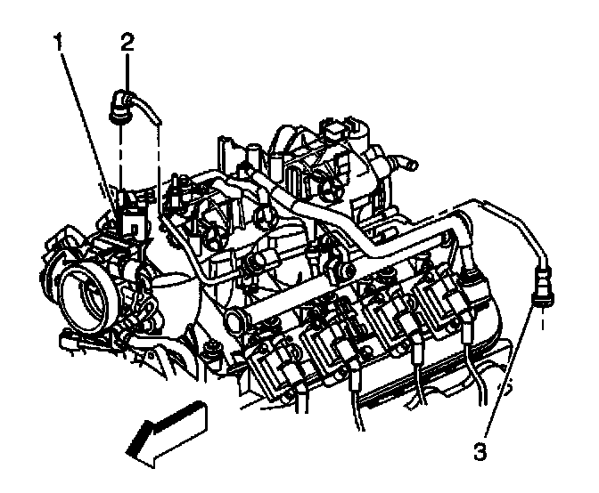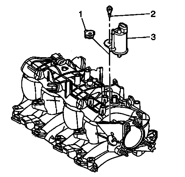 6. Remove the EVAP purge solenoid (3) and the insulator (1) from the engine.