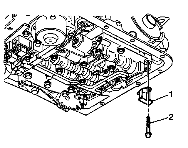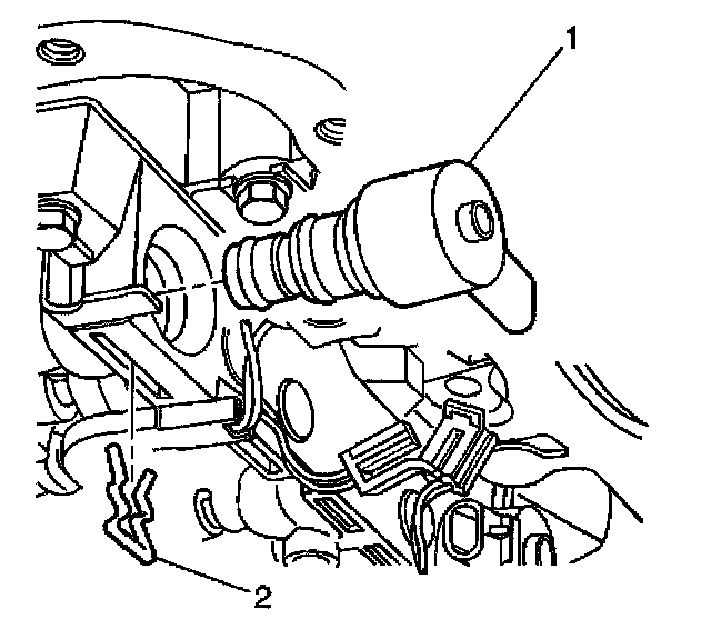 8. Remove the TCC PWM solenoid retainer (2) with a small screwdriver. Rotate the solenoid (1) in the bore, if necessary, until the flat part of the retainer (2) is visible.