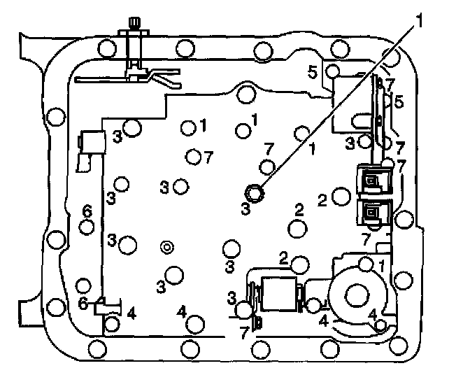 9. Remove the TCC PWM solenoid (1) in order to access the TCC solenoid retaining bolts.
