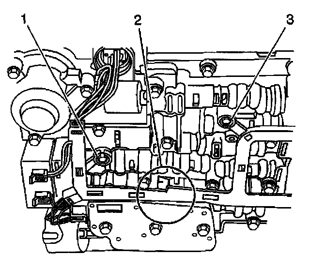 15. Place the tab between the valve body and the pressure switch in the location shown (2). Press the harness into position on the valve body bolt bosses (1,3).