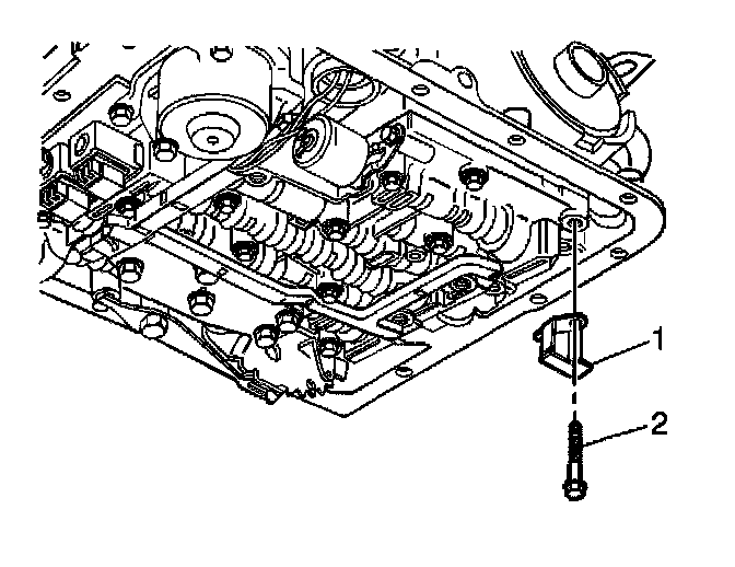 18. Install the transmission fluid indicator stop bracket (1) and bolt (2).
