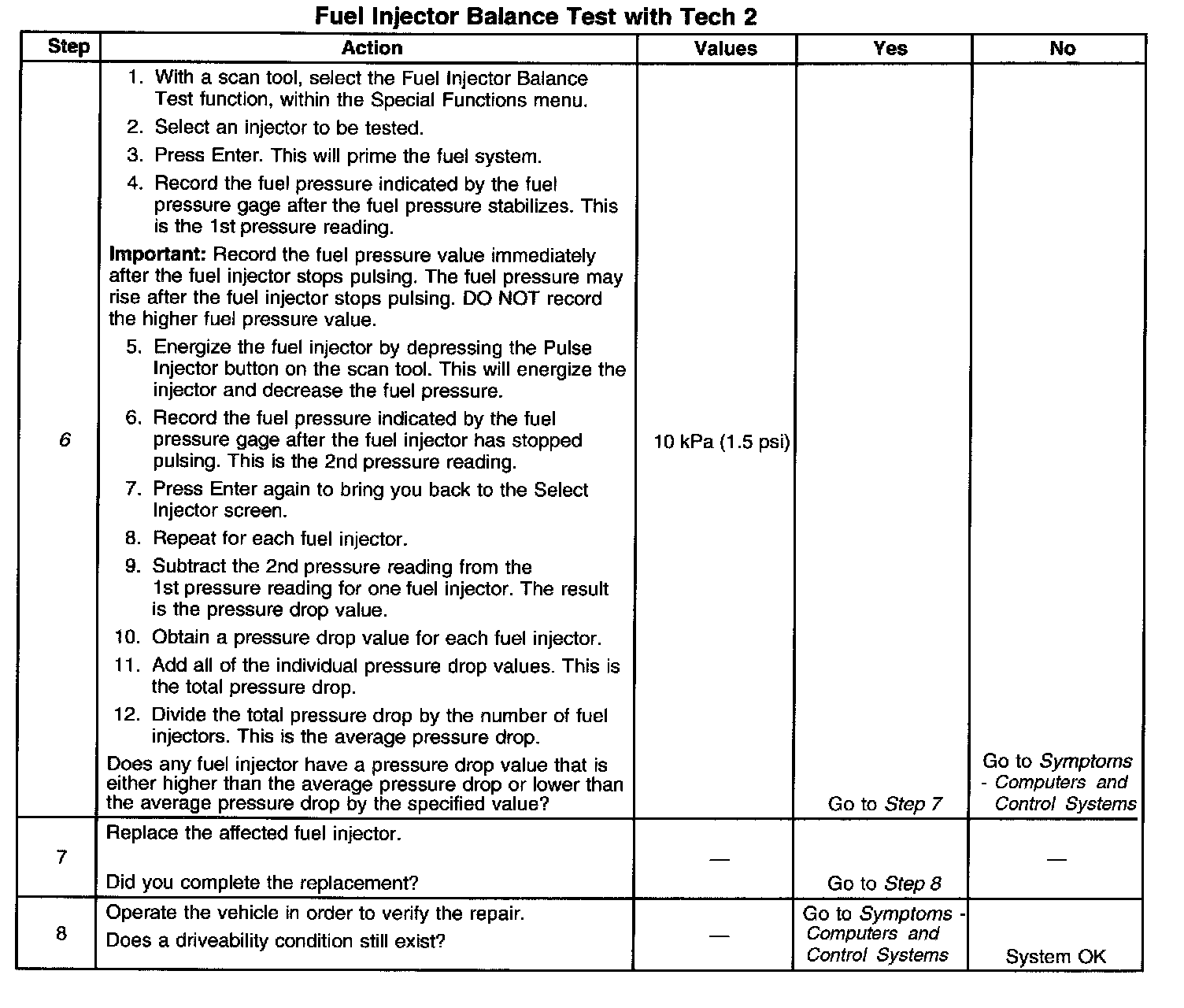 6. If the pressure drop value for each fuel injector is within 10 kPa (1.5 psi) of the average pressure drop value, the fuel injectors are flowing properly. Calculate the pressure drop value for each fuel injector by subtracting the second pressure reading from the first pressure reading.