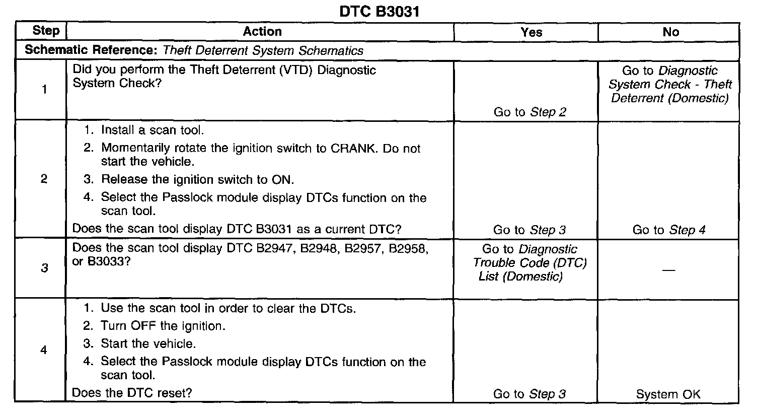 3. This step tests for the proper operation of the 12 V reference, Security Sensor Power, circuit, sensor ground circuit, and passlock(TM) sensor signal data circuit. Troubleshoot the appropriate DTC prior to diagnosing DTC B3031.