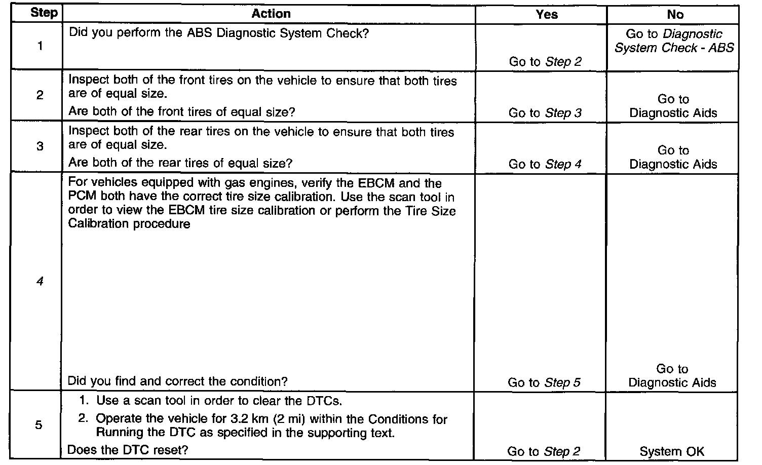 The EBCM detects that one wheel speed input is 10 percent greater than or 10 percent less than the other wheel speed inputs within 3.2 km (2 miles) of driving.