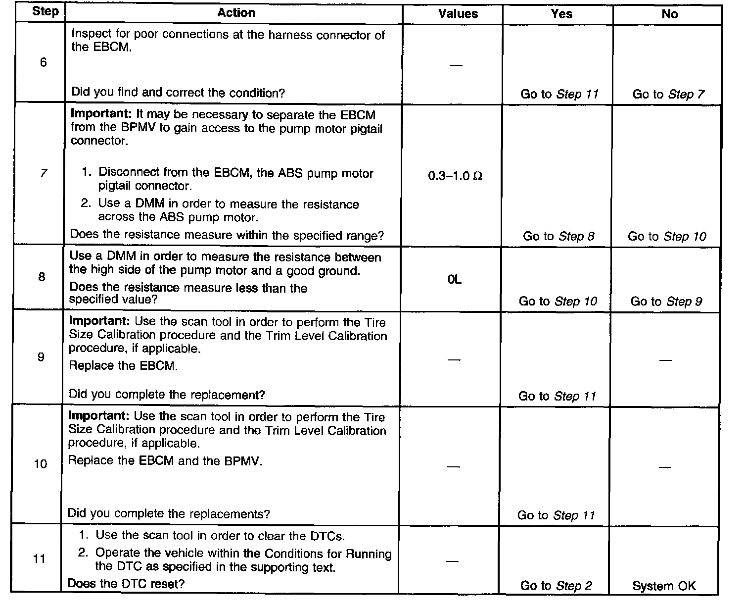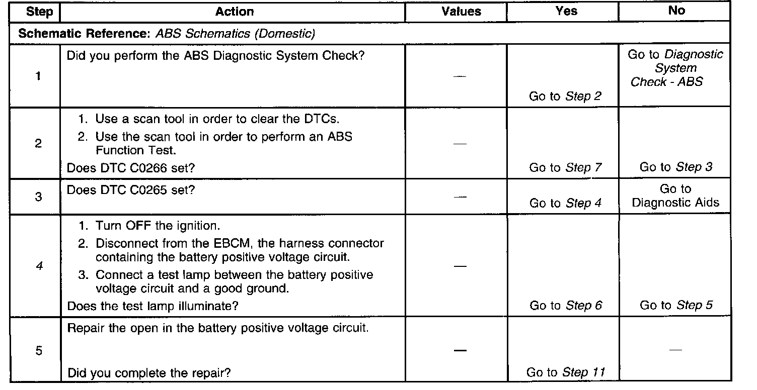 Diagnostic Aids Important: Whenever the EBCM is replaced for DTC C0265 or C0266, the ABS pump motor and motor circuitry must be tested for the proper resistance. Refer to steps 7 and 8 in the diagnostic table below for testing procedures and resistance values.