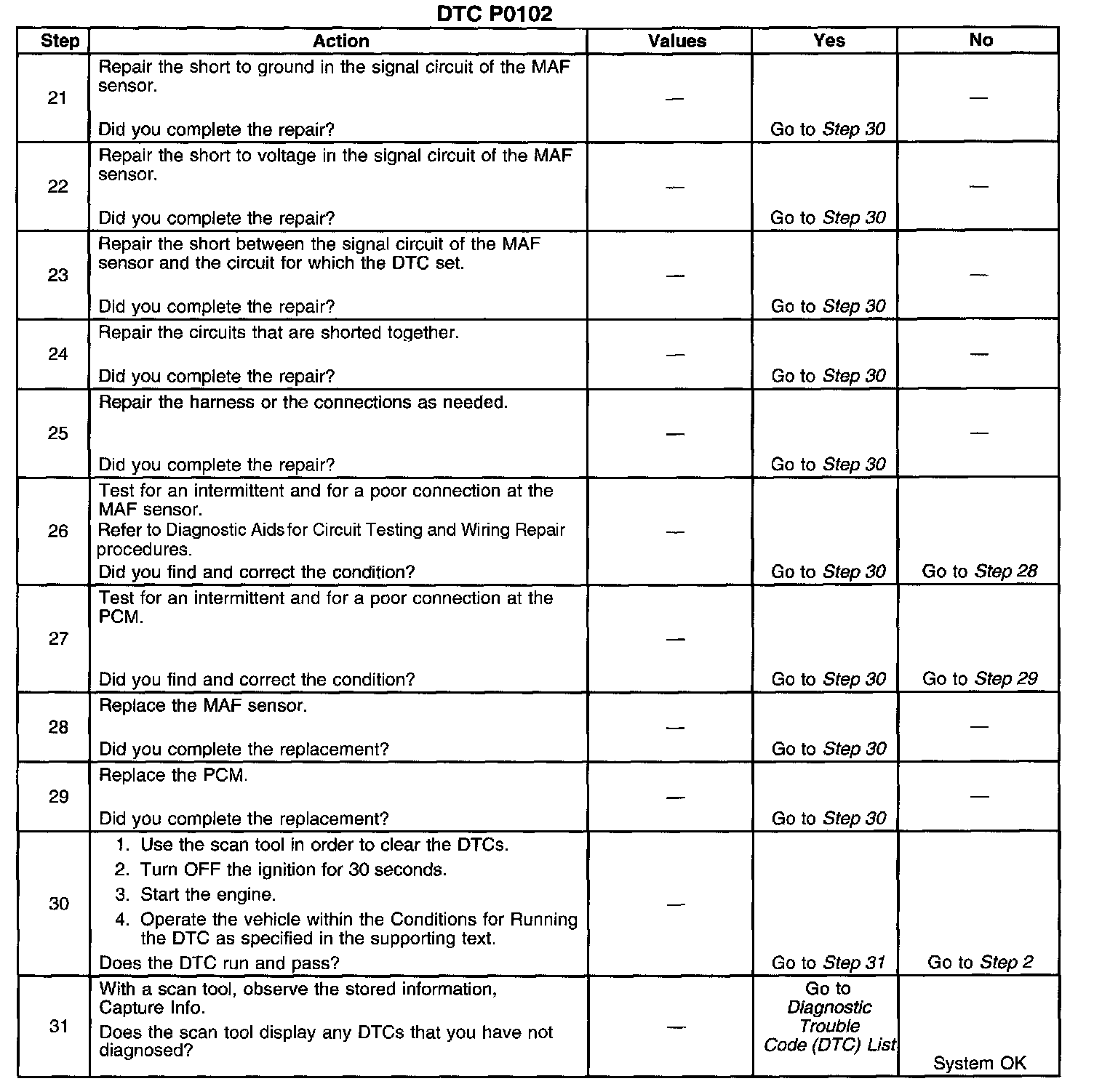 ^ A low minimum air rate through the sensor bore may cause this DTC to set at idle or during deceleration. Inspect for any vacuum leaks downstream of the MAF sensor.