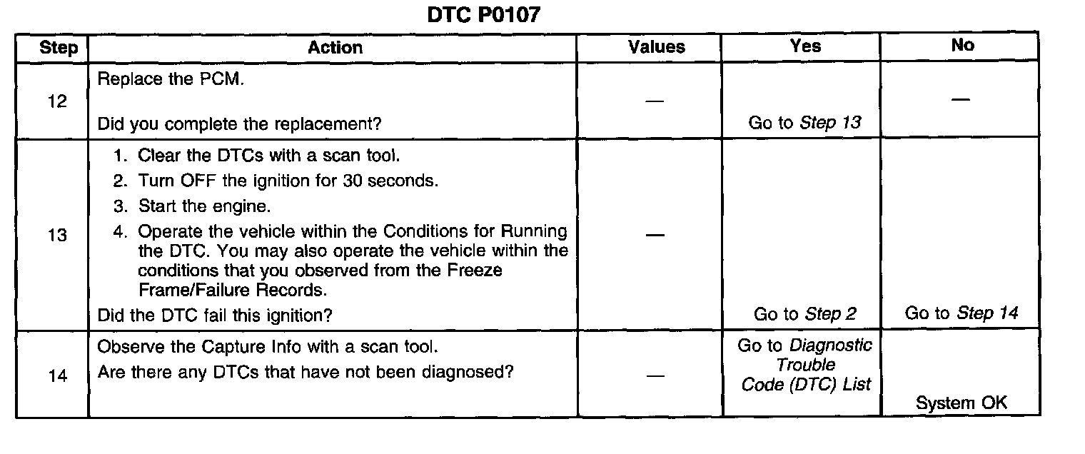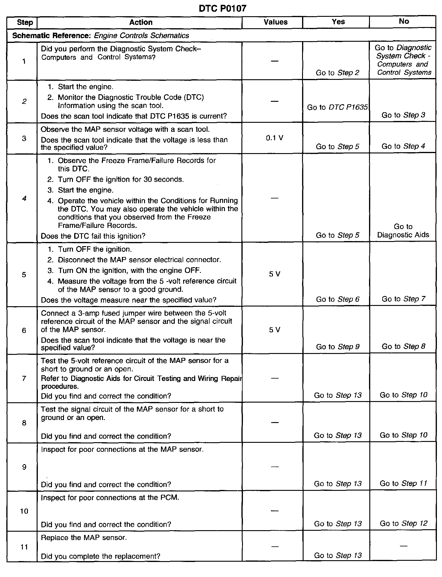 If the PCM detects a MAP sensor signal voltage that is excessively low, diagnostic trouble code (DTC) P0107 will set.