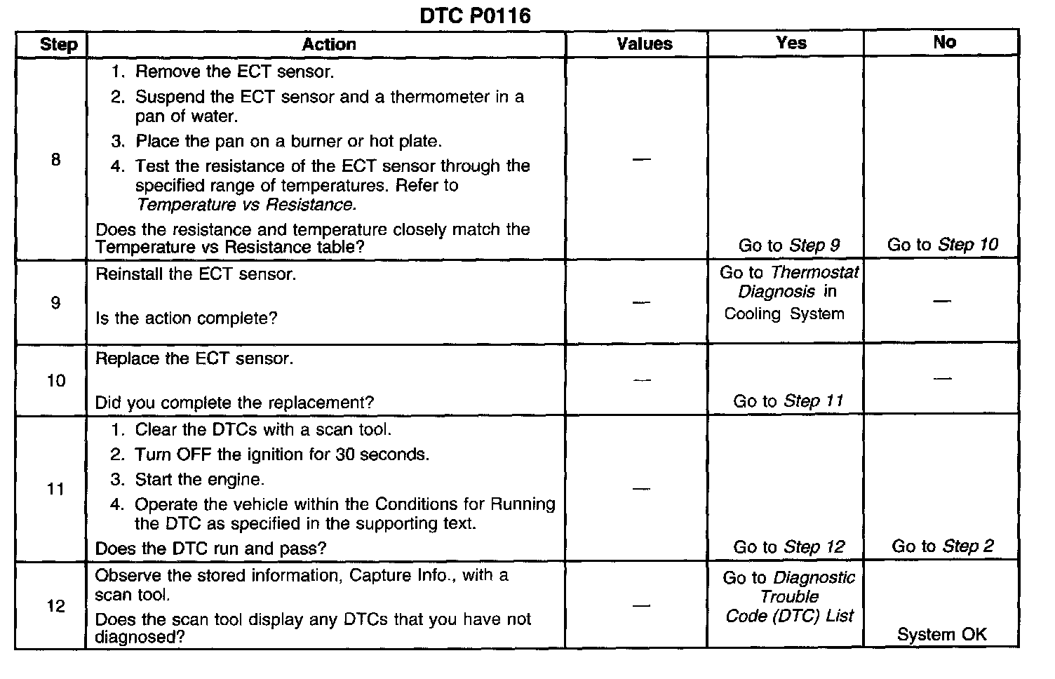 ^ When checking the ECT sensor, the Temperature vs Resistance table should be used in order to determine if a skewed sensor is the problem.