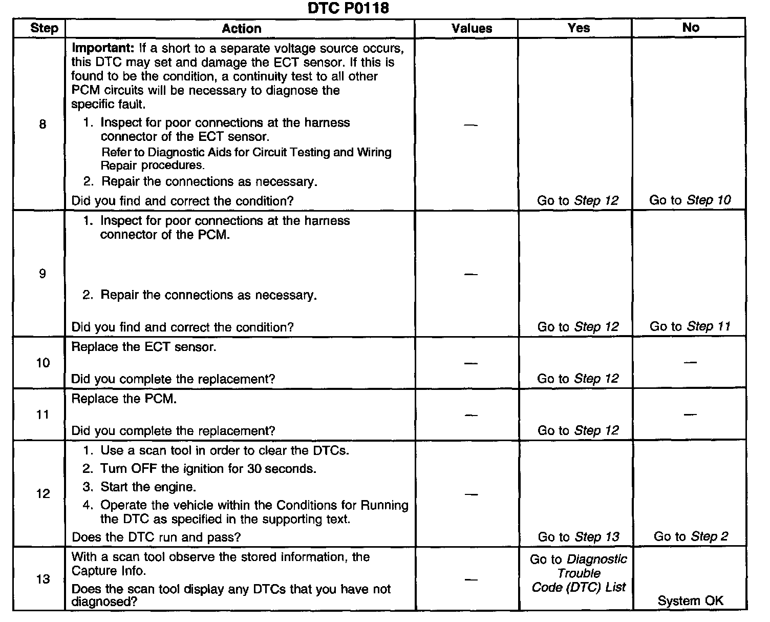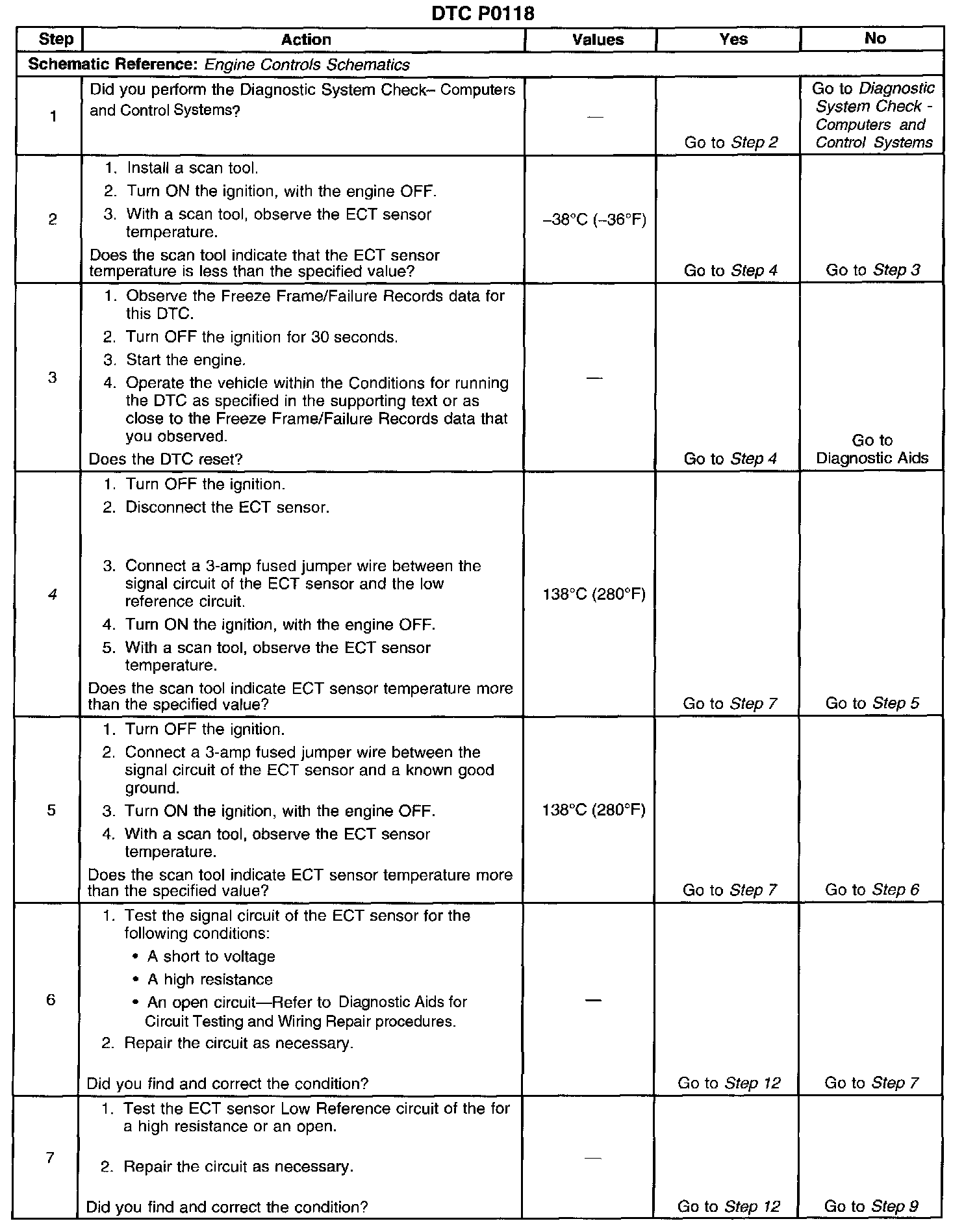 CIRCUIT DESCRIPTIONThe engine coolant temperature (ECT) sensor is a variable resistor, sometimes called a thermistor, that measures the temperature of the engine coolant. The ECT sensor has a signal circuit and a low reference circuit. The powertrain control module (PCM) supplies 5 volts to the ECT signal circuit. When the ECT is cold, the sensor resistance is high. When the ECT increases, the sensor resistance lowers. With high sensor resistance, the PCM detects a high voltage on the ECT signal circuit. With lower sensor resistance, the PCM detects a lower voltage on the ECT signal circuit. If the PCM detects an excessively high ECT signal voltage, which is a low temperature indication, DTC P0118 sets.