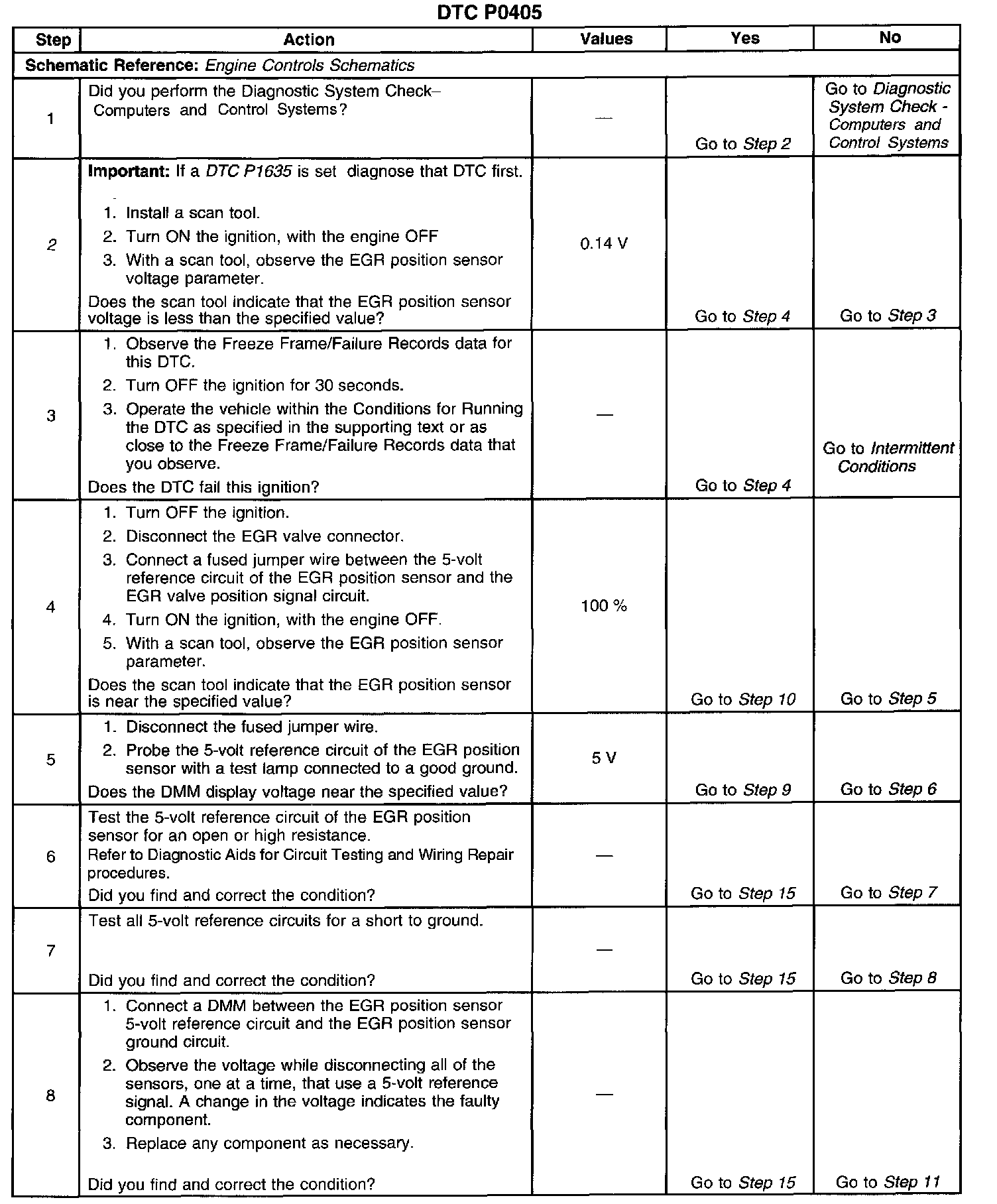 CIRCUIT DESCRIPTIONThe powertrain control module (PCM) monitors the exhaust gas recirculation (EGR) valve pintle position in order to ensure that the valve responds properly to commands from the PCM and to detect a fault if the pintle position sensor circuit is open or shorted. If the PCM detect an excessively low EGR sensor signal voltage, this diagnostic trouble code (DTC) sets.