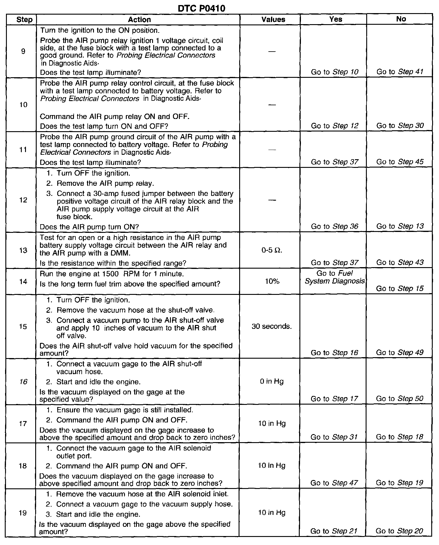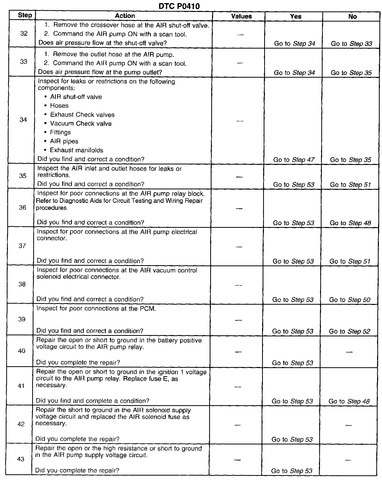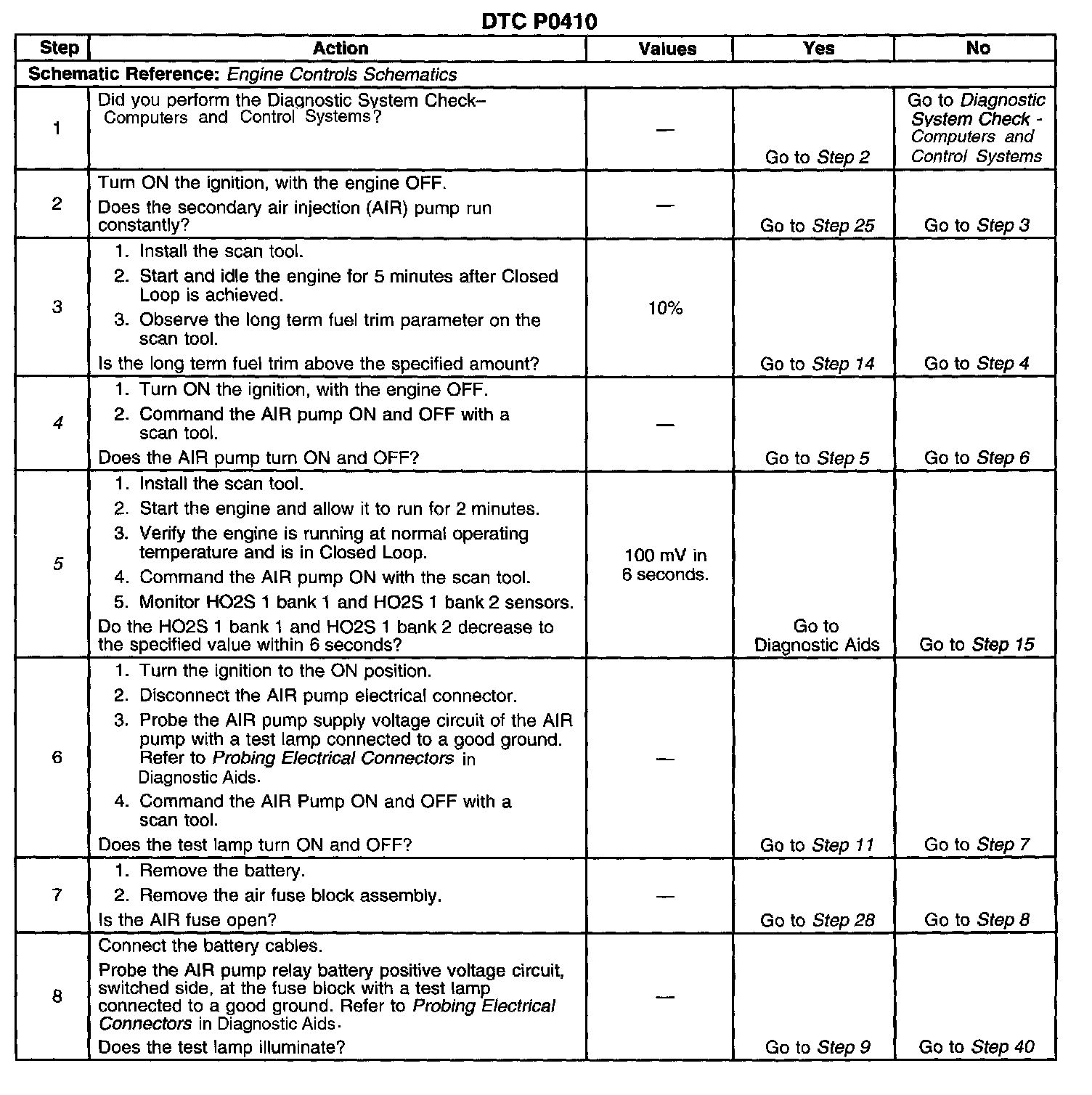 The PCM monitors the heated oxygen sensor (HO2S) voltages to diagnose the AIR system. During the AIR test, the PCM activates the AIR pump during Closed Loop operation. When the AIR system is activated, the PCM monitors the HO2S voltages and short term fuel trim values for both banks of the engine. If the AIR system is operating properly, the HO2S voltages should go low and the short term fuel trim should go high. If the PCM determines that the HO2S voltages for both banks did not respond as expected during the tests, DTC P0410 sets. If only one sensor responded, the PCM sets either a DTC P1415 or DTC P1416 to indicate on which bank the AIR system is inoperative.