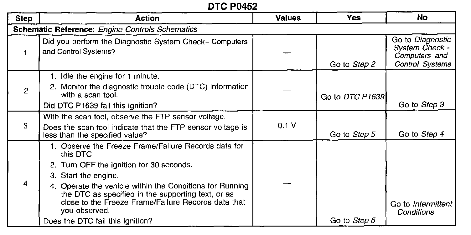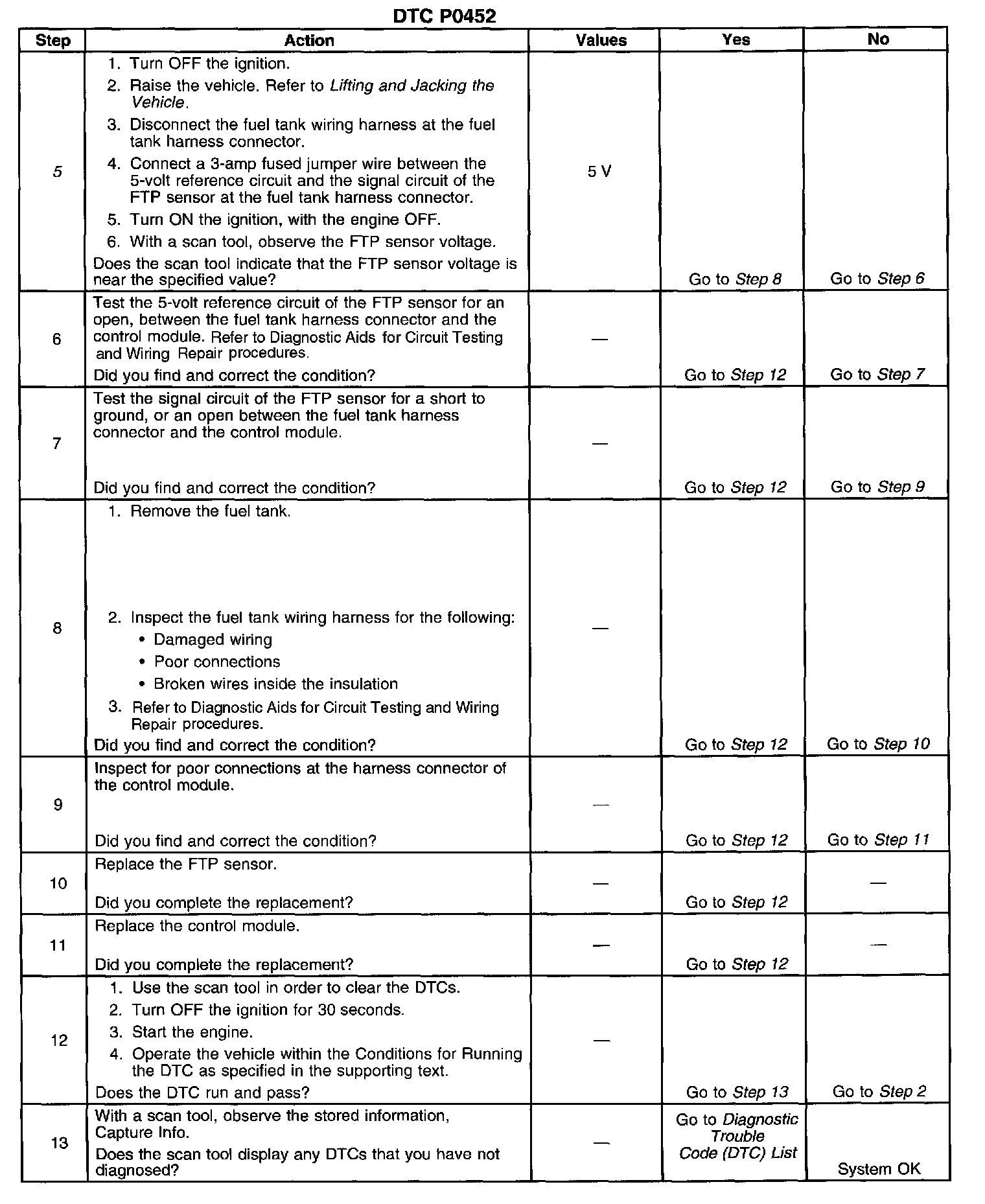 CIRCUIT DESCRIPTIONThe control module monitors the fuel tank pressure (FTP) sensor signal in order to detect vacuum decay and excess vacuum during the enhanced evaporative emission (EVAP) diagnostic. The control module supplies a 5-volt reference and ground to the sensor. The FTP sensor signal voltage increases as the FTP decreases, negative pressure or vacuum, high voltage. The FTP sensor signal voltage decreases as the FTP increases, positive pressure, low voltage. This DTC sets when the FTP sensor signal goes below a predetermined value.