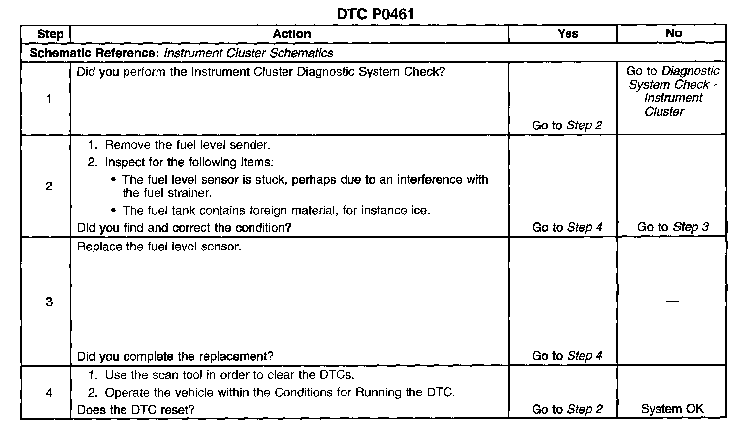 CIRCUIT DESCRIPTIONThe fuel level sensor changes resistance based on the fuel level. The PCM monitors the signal circuit of the fuel level sensor in order to determine the fuel level. When the fuel tank is full, the fuel level sensor resistance is high and the PCM senses a high fuel level sensor signal voltage. When the fuel tank is empty, the fuel level sensor resistance is low and the PCM senses a low fuel level sensor signal voltage. The PCM uses the signal circuit of the fuel level sensor in order to calculate the total remaining fuel percentage in the tank. The PCM sends the fuel level percentage via the fuel level signal circuit to the instrument cluster in order to control the fuel gage. The fuel level information is also used for misfire and EVAP diagnostics.