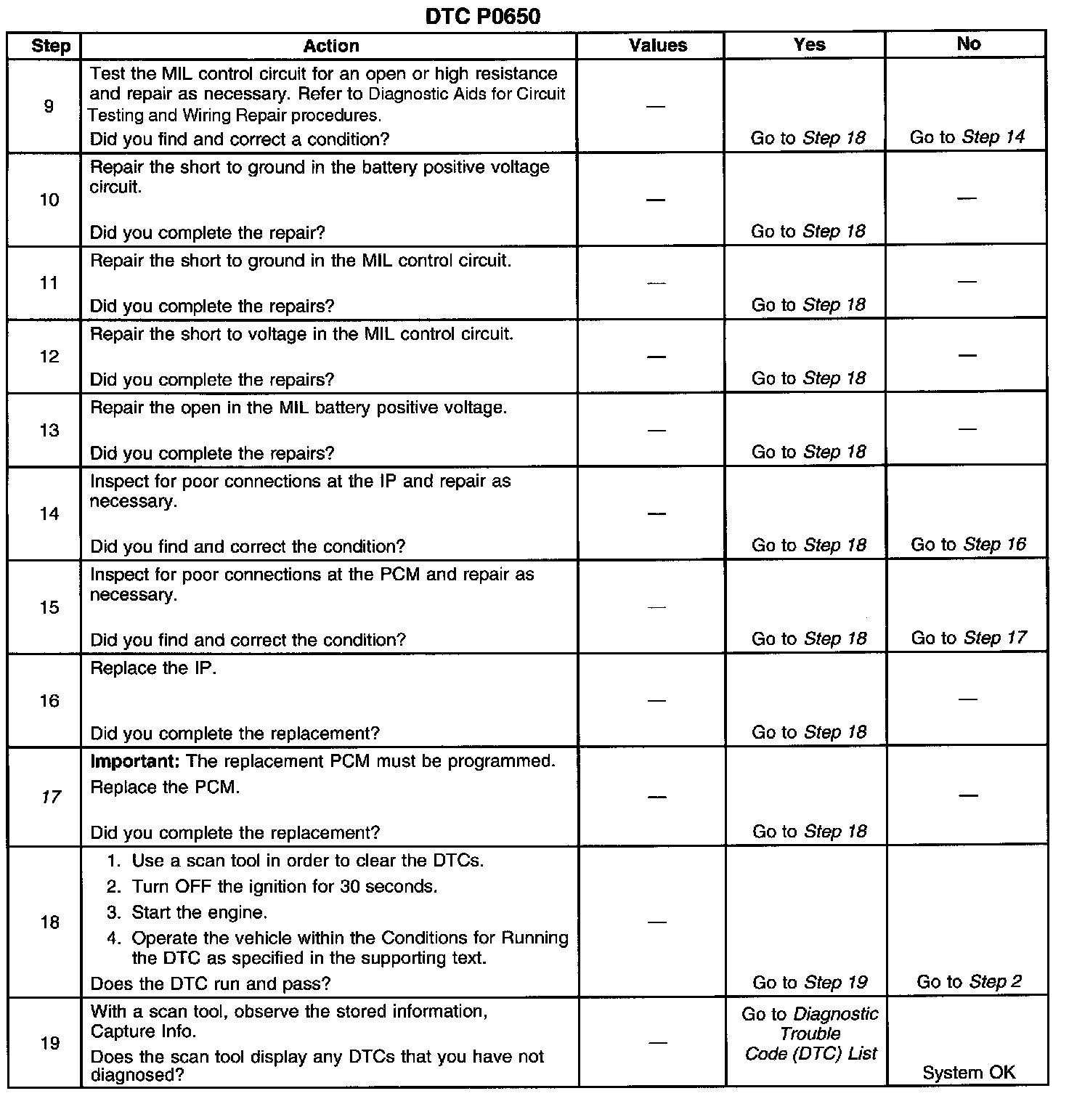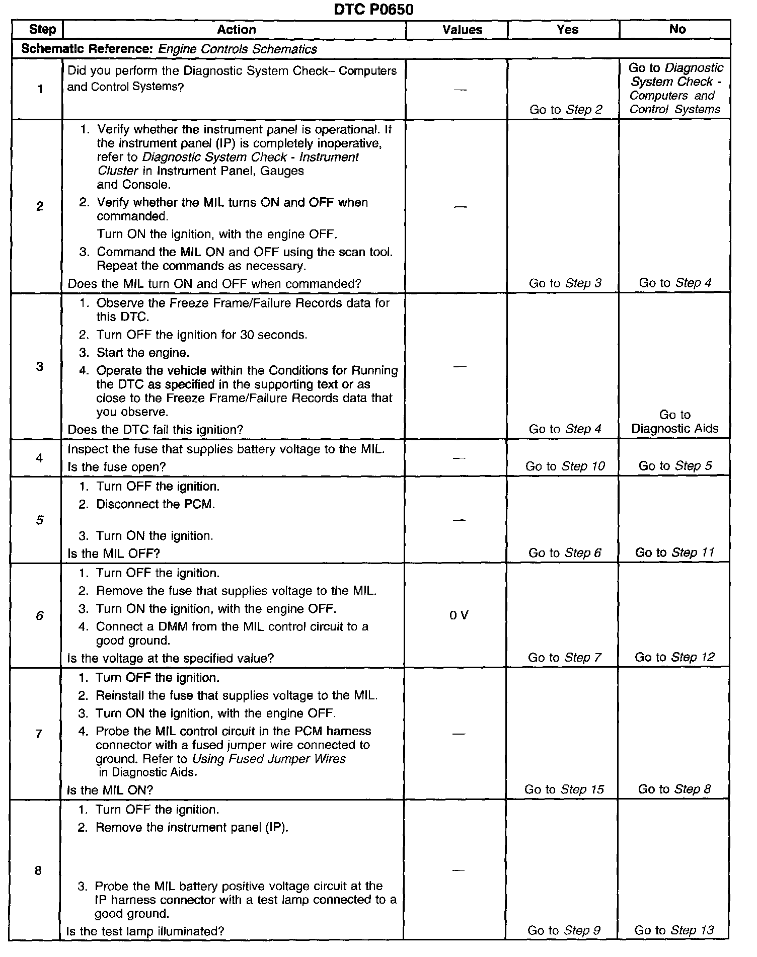 5. This step tests for a short to ground in the MIL control circuit. With the PCM disconnected and the ignition ON the MIL should be OFF.