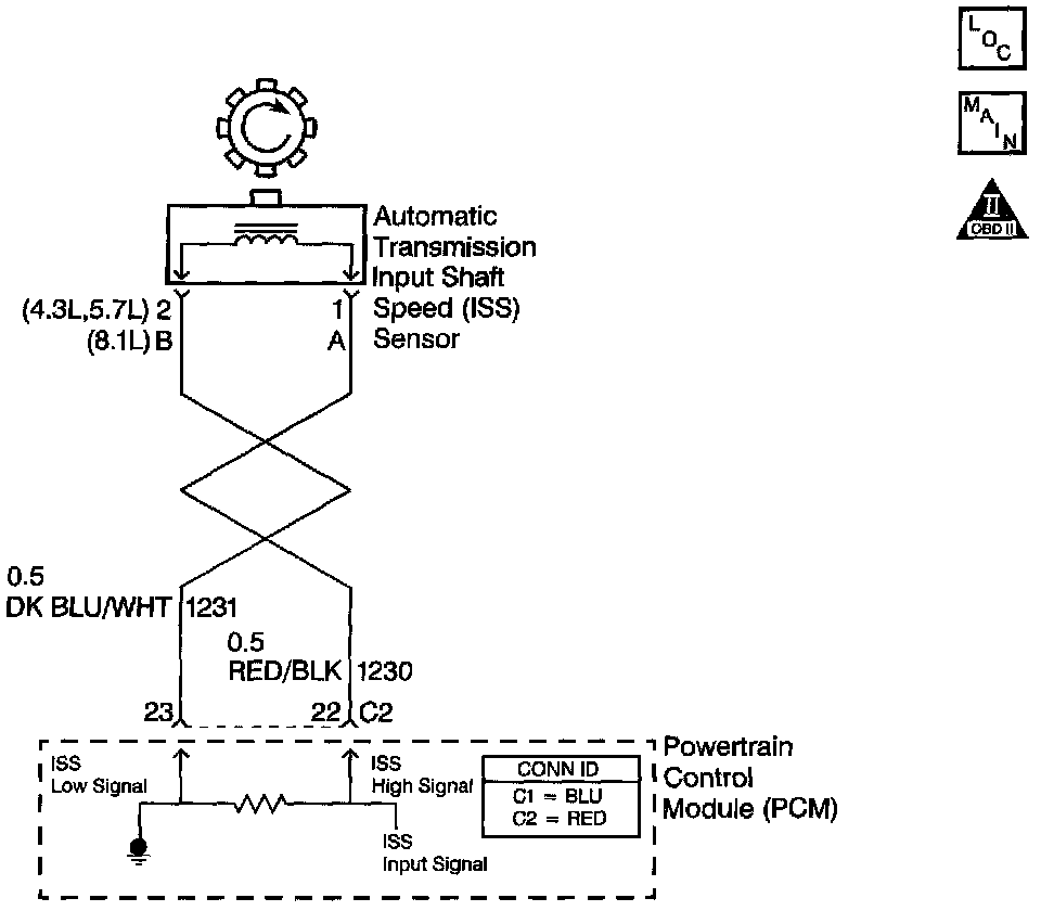 The Automatic Transmission Input Shaft Speed (AT ISS) sensor provides transmission input speed to the Powertrain Control Module (PCM). The AT ISS sensor is a Permanent Magnet (PM) generator. The sensor mounts into the transmission case and maintains a slight air gap between the sensor and the forward clutch housing. The PM generator produces an AC voltage as the forward clutch housing rotor teeth pass through the sensor's magnetic field. The AC voltage level increases as the turbine shaft speed increases. The PCM converts the AC voltage into a digital signal. The PCM determines actual turbine speed using the digital signal. The PCM uses the input speed to calculate torque converter slip speed, and gear ratios.