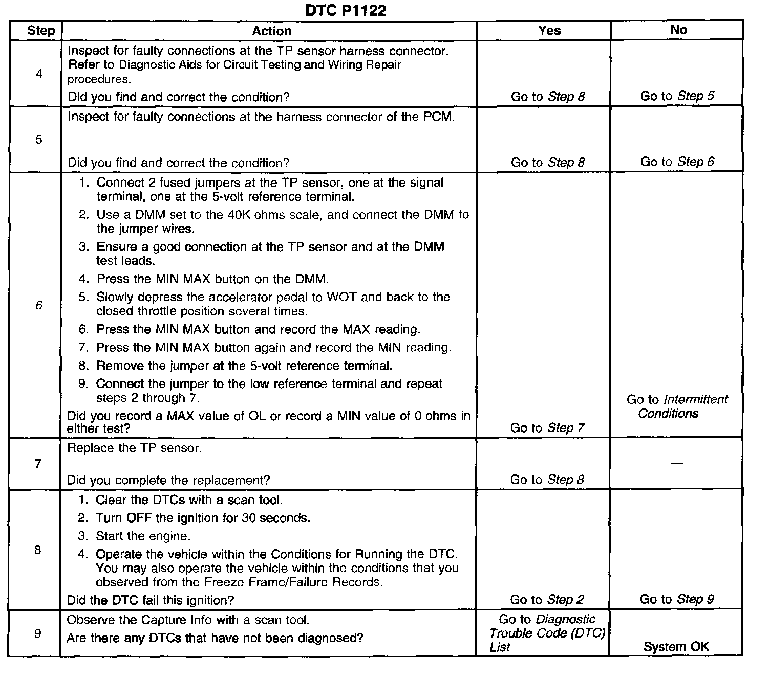 Rotation of the TP sensor rotor from the closed throttle position to the wide open throttle (WOT) position provides the PCM with a signal voltage from less than 1 volt to more than 4 volts through the TP sensor signal circuit. If the PCM detects an intermittent excessively low signal voltage, this diagnostic trouble code (DTC) will set.