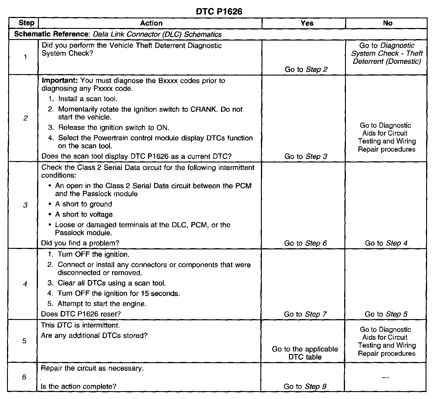 ^ If the Class 2 Serial Data circuit is shorted to ground or shorted to voltage, then all systems connected to the serial data circuit will not be able to communicate properly. Systems capable of storing loss of communications DTCs, or the DTCs with the letter "U" as a prefix, will have these codes stored in their memory. If a DTC U1192 is stored in the PCM memory along with the P1626, then a fault occurred at some point after the PCM received the correct password. The theft system must also be checked for intermittent operation due to a loss of power or ground to the module itself. After repairing the cause of DTC P1626, clear all DTCs from the systems capable of storing this DTC and DTC U1192.