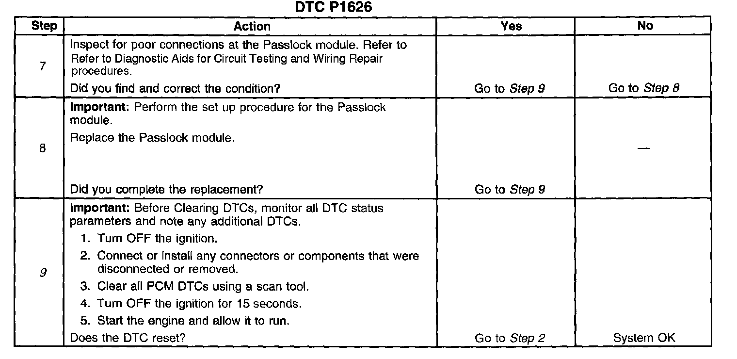 CIRCUIT DESCRIPTIONThe powertrain control module (PCM) communicates with other modules using the Class 2 Serial Data circuit. The Passlock module sends a fuel continue password to the PCM, via the Class 2 Serial Data circuit, after the system has sensed the proper operation of the ignition switch and lock, and determined that the switch and lock have not been tampered with. If this password matches the password stored in the PCM, fuel will be enabled. If the Passlock module does not send a password, or if the PCM does not receive it, the vehicle will not start, or it may start and stall. This will set a DTC P1626 in the PCM memory. If communication is lost after receiving the password, the Passlock system will go into Fail Enable, set a U1192 in the control module, and the engine will continue to run. This will allow the engine to restart on future ignition cycles but may set a DTC P1626 as the engine is started. If the battery is disconnected or the codes are cleared, the vehicle will lose its Fail Enable status and will not start until communication is re-established.