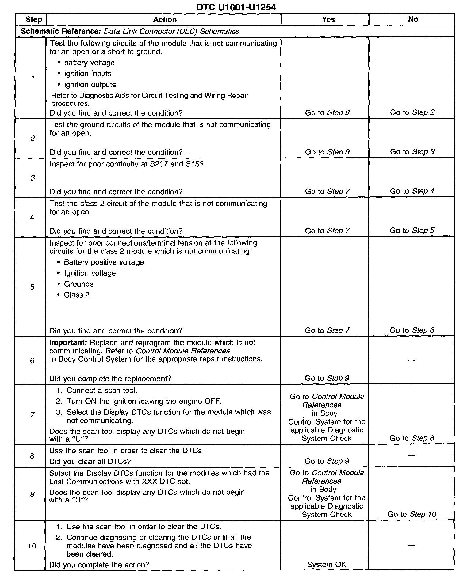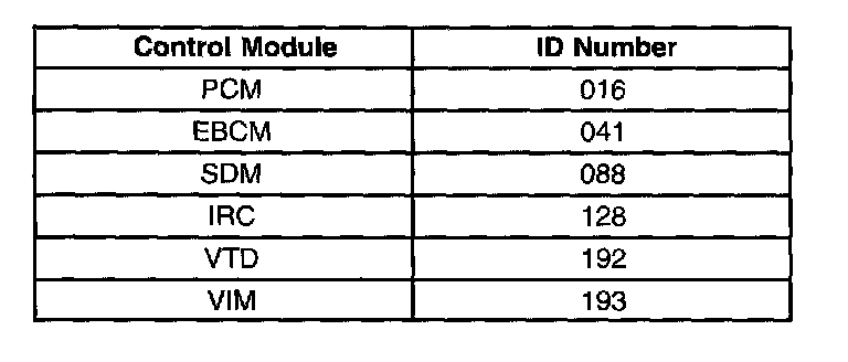 The Control Module ID Number list provides a method for determining which module is not communicating. A module with an internal class 2 serial data circuit malfunction or which loses power during the current ignition cycle would have a Lost Communication DTC set by other modules. Use the Control Module ID Number list in order to determine which module is not communicating and the Lost Communications with XXX diagnostic table in order to diagnose the malfunction. When no message is detected from a learned identification number for five seconds, a DTC U1xxx is set.