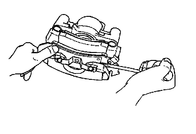 Notice: Support the brake caliper with heavy mechanic's wire, or equivalent, whenever it is separated from it's mount and the hydraulic flexible brake hose is still connected. Failure to support the caliper in this manner will cause the flexible brake hose to bear the weight of the caliper, which may cause damage to the brake hose and in turn may cause a brake fluid leak.