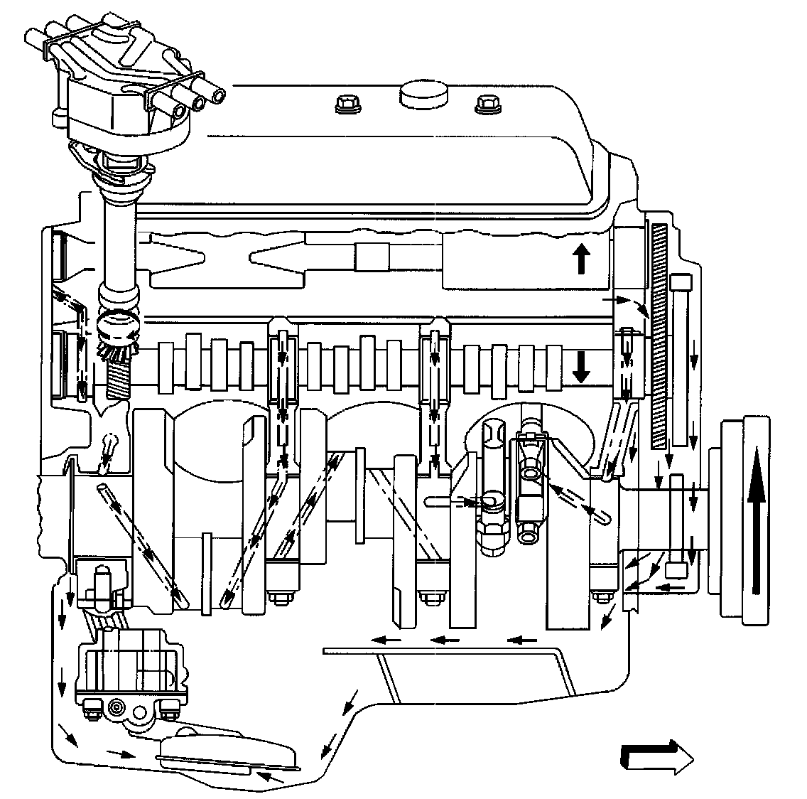 Full pressure lubrication, through a full-flow oil filter is supplied by a gear-type oil pump. Oil is drawn up through the oil pump screen and passes through the pump to the oil filter. The oil filter is a full-flow paper element unit with an anti-drain back valve. An oil filter bypass valve is used to ensure adequate oil supply, in the event the filter becomes plugged or develops excessive pressure drop. Filtered oil flows into the main gallery and then to the camshaft, the balance shaft, the rear bearing, and the crankshaft bearings. The valve lifter oil gallery supplies oil to the valve lifters. Oil flows from the valve lifters through the hollow valve pushrods to the valve rocker arms. Oil drains back to the crankcase through the oil drain holes in the cylinder head. The camshaft timing chain is drip fed from the front camshaft bearing. The pistons and piston pins are lubricated by oil splash.