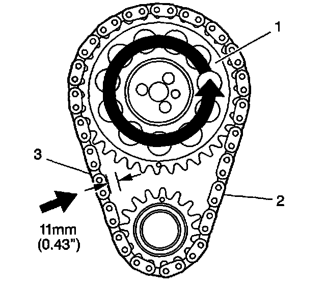 2.2. Measure the free play on the slack side (3) of the camshaft timing chain.
